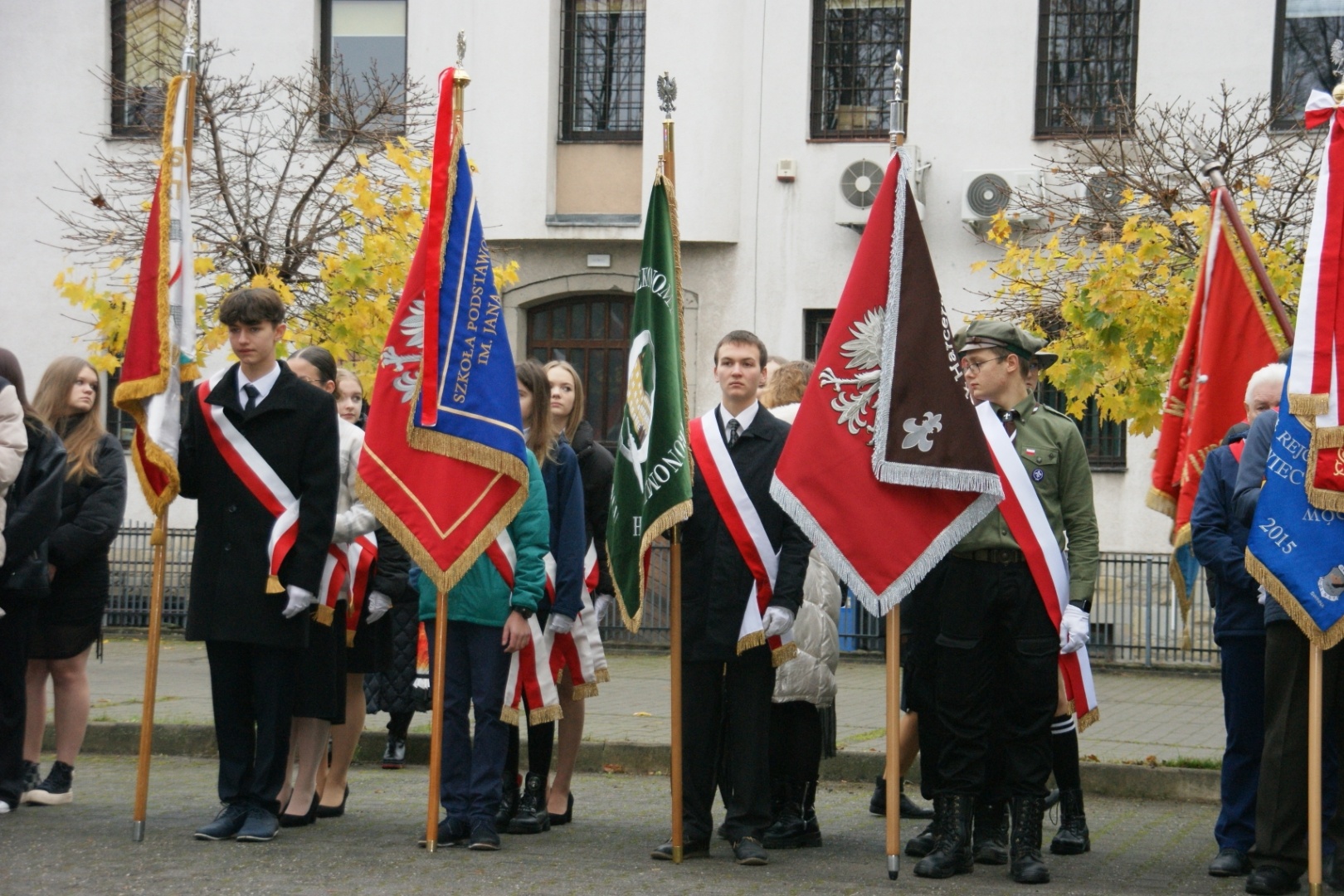 Poczet sztandarowy szkoły reprezentowali: Konrad Wierzbinka klasa 1aT, Patrycja Wiewióra klasa 2CO, Ania Gielata klasa 2CO.