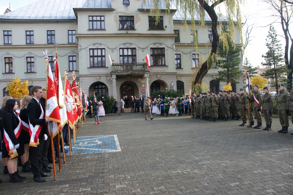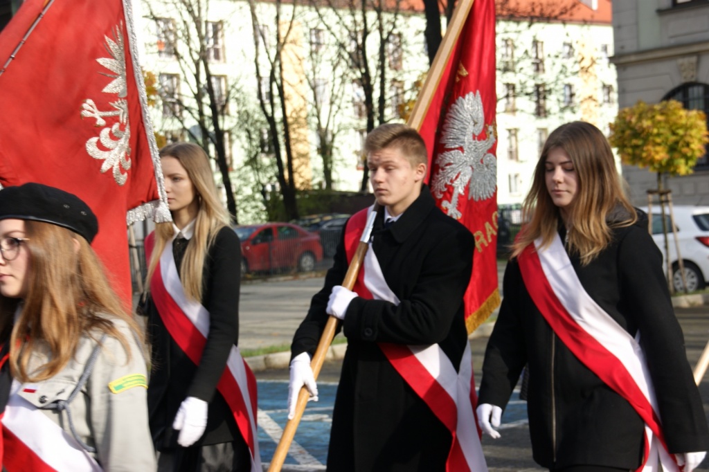 11 listopada w Żywcu zorganizowane zostały miejskie i powiatowe uroczystości z okazji Narodowego Święta Niepodległości, podczas których naszą Szkołę reprezentował Poczet Sztandarowy. Warto przypomnieć, że Żywiec należy do jednych z pierwszych miast, które w 1918 wyswobodziły się z rąk zaborców. Już 30 października 1918 r. na sygnał z Krakowa grupa mieszczan rozbroiła magistrackich wartowników. Następnego dnia na rynku zebrał się spory tłum gotowy do walki. Po negocjacjach dowódcy wojsk austriackich złożyli broń. Fakt ten został przyjęty z wielką radością, zaś żołnierzom, a byli to głównie Rumuni i Węgrzy, wypłacono żołd i wydano zaprowiantowanie na 10 dni. Odchodzących żołnierzy uroczyście żegnano, odśpiewano nawet hymn polski, rumuński i węgierski. 11 listopada 2019 uroczystości rozpoczęły się od złożenia kwiatów i wiązanek przez delegacje samorządowców przed popiersiem Józefa Piłsudskiego przy budynku żywieckiego Starostwa Powiatowego. Potem uczestnicy przeszli do konkatedry, gdzie odprawiona została uroczysta Msza św. Po nabożeństwie dalsza część uroczystości patriotycznych zorganizowana została na żywieckim Rynku. Były okolicznościowe przemówienia, a później przedstawiciele władz miejskich, powiatowych oraz różnych organizacji, złożyli na żywieckim Rynku kwiaty i zapalili znicze. Szkołę w Poczcie Sztandarowym Szkoły reprezentowali: Sebastian Rąba uczeń klasy I AT, Paula Cynkier – uczennica klasy II AO oraz Kamila Kiełtucka – uczennica klasy II AO. Opiekunem młodzieży była dr Małgorzata Terteka.