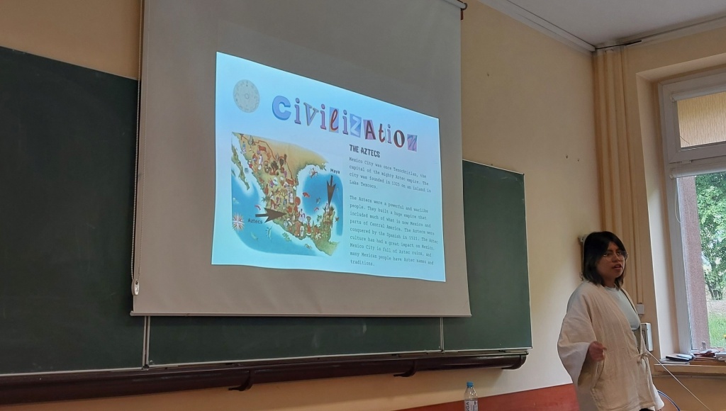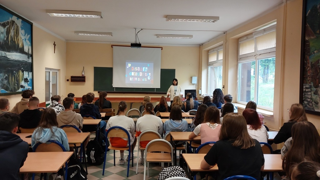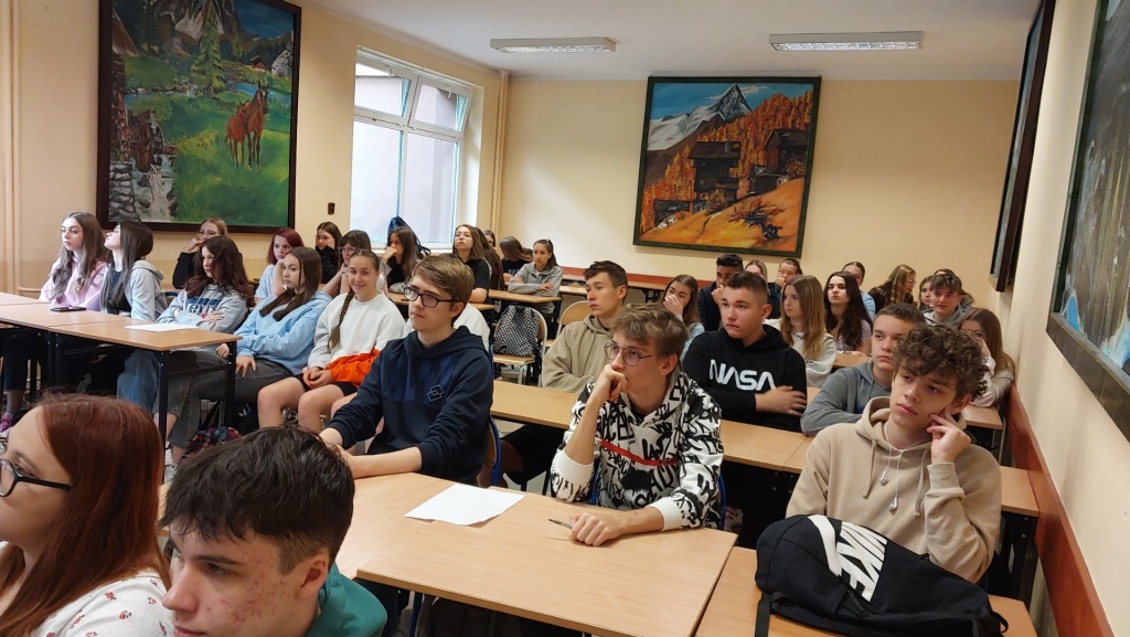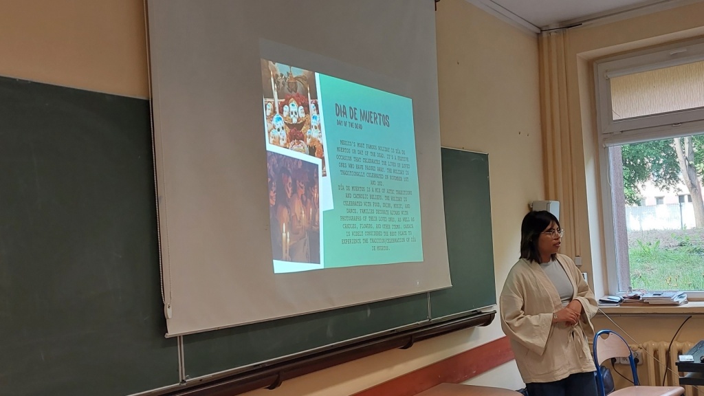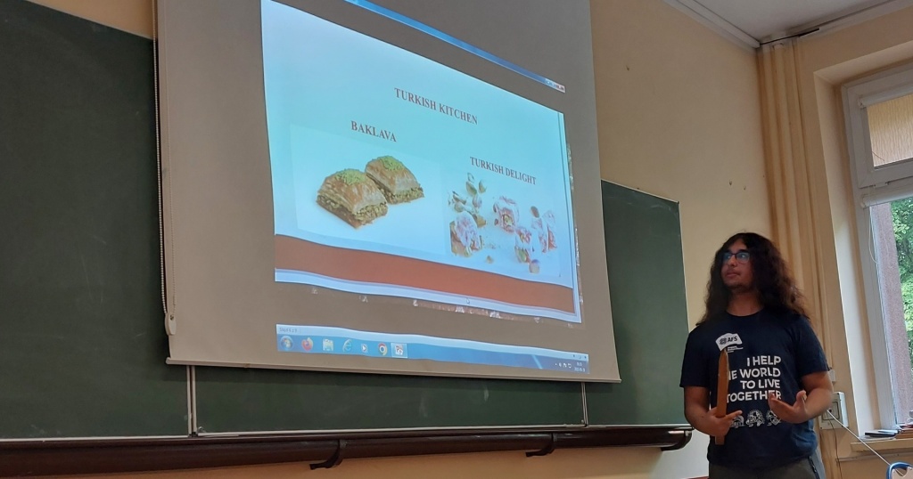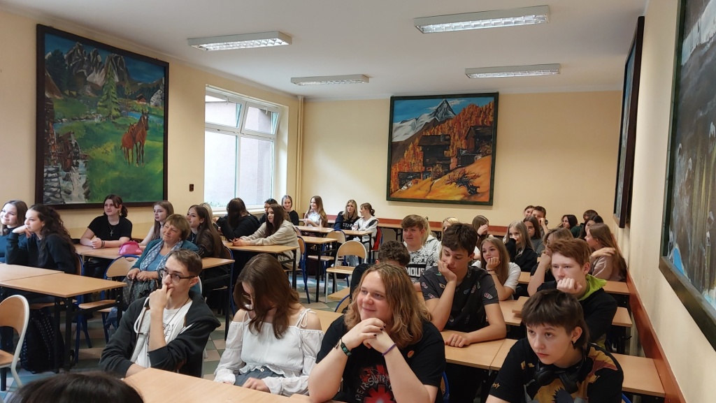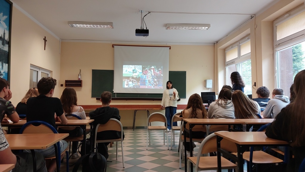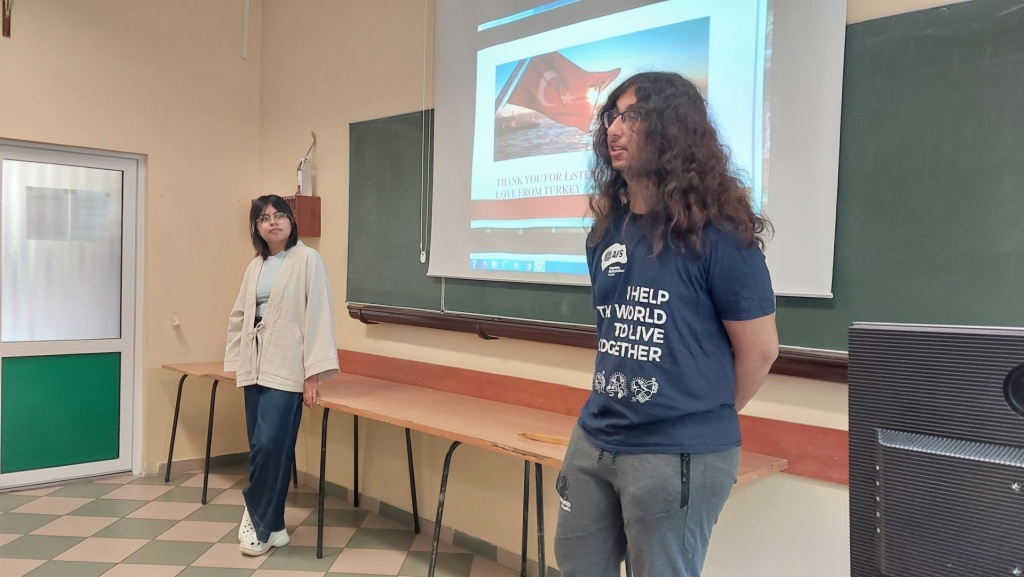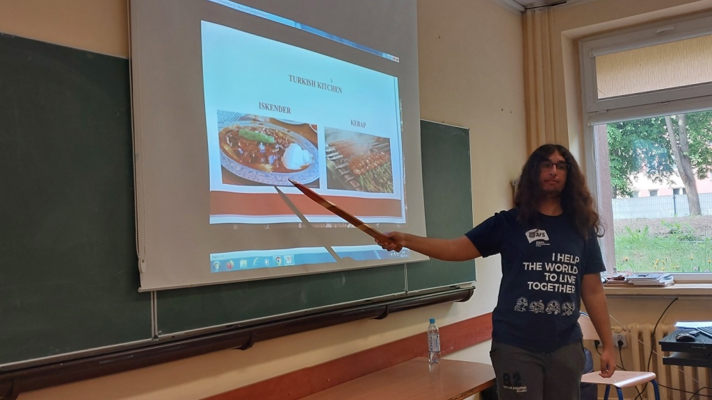 29 maja 2023 roku w ZSME w Żywcu we współpracy ze Stowarzyszeniem AFS odbyło się niecodzienne spotkanie trzech kultur: polskiej, meksykańskiej i tureckiej. Mieliśmy okazję gościć w naszej szkole uczestników wymian międzynarodowych Iranę z Meksyku oraz Tana z Turcji. W zajęciach wzięli udział uczniowie wszystkich klas policyjnych mających rozszerzenie z języka angielskiego (1bo, 1co, 2bo i 3co). Zajęcia odbywały się wyłącznie w języku angielskim. Podczas zajęć Iran i Tan przedstawili uczniom kulturę swoich krajów, historię, tradycyjne jedzenie, obyczaje, fakty geograficzne, atrakcje turystyczne oraz sporty narodowe. Każdy z nich podzielił się swoimi spostrzeżeniami na temat Polski, naszej „egzotycznej” kultury oraz ogromnej gościnności Polaków goszczących ich u siebie w domach w ramach projektu. Uczniowie mieli okazję zapytać wolontariuszy między innymi o systemy edukacji w ich krajach. Chcieli również dowiedzieć się jakie jedzenie w Polsce smakuje im najbardziej (wygrały krokiety, kotlet schabowy i naleśniki