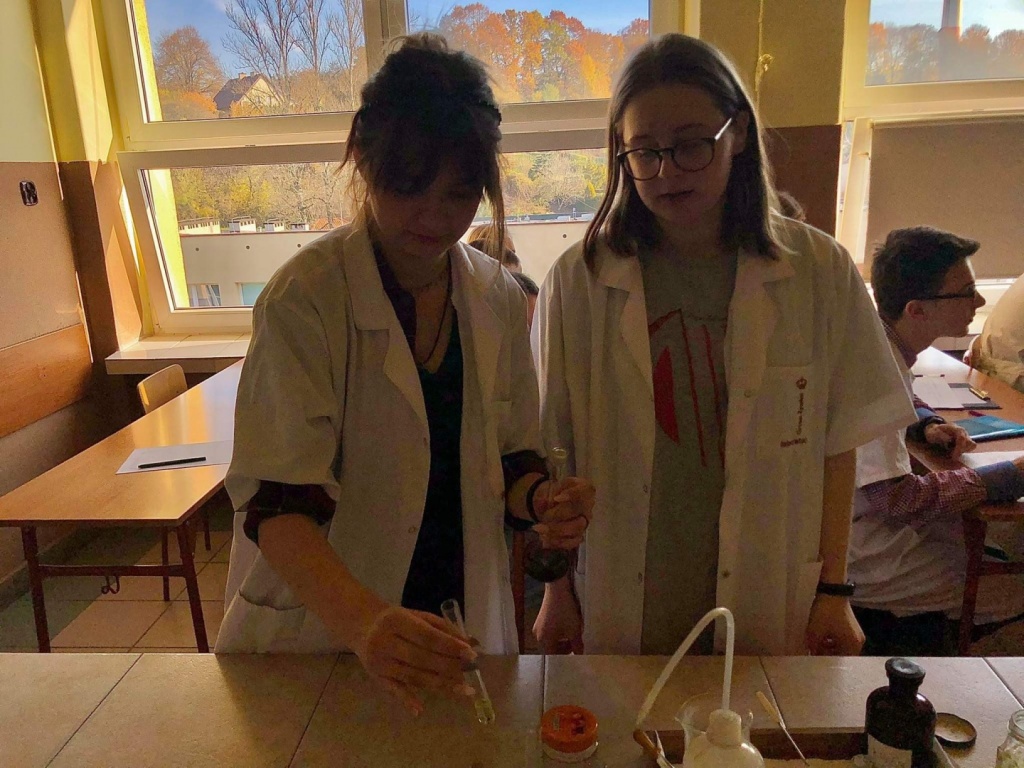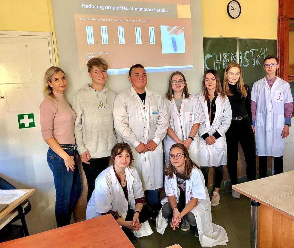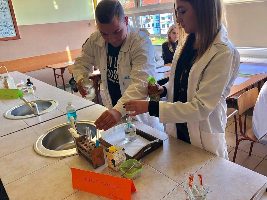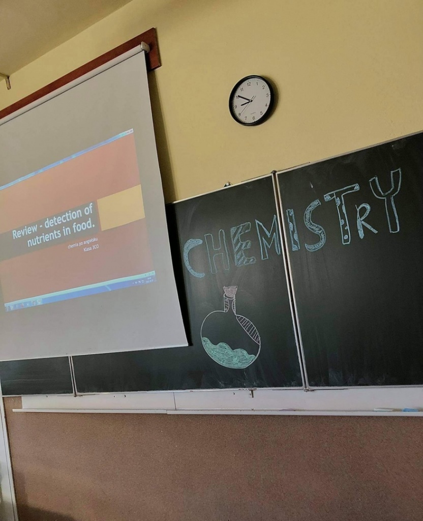 27 października odbyła się w naszej szkole otwarta lekcja chemii w języku angielskim, której temat brzmiał: Review - detection of nutrients in food. Uczniowie klasy 3CO wykonywali trzy różne doświadczenia, które miały na celu wykryć substancje odżywcze w produktach spożywczych. Zademonstrowali następujące doświadczenia: Próbę Trommera, reakcję ksantoproteinową, reakcję biuretową, odróżnianie tłuszczów nasyconych od nienasyconych, wykorzystując odpowiednie odczynniki chemiczne. Uczniowie oraz nauczyciele podczas lekcji posługiwali się wyłącznie językiem angielskim: opisywali wykonywane czynności podczas wykonywania ćwiczeń, obserwacje, wnioski oraz uzupełniali przygotowaną kartę pracy.