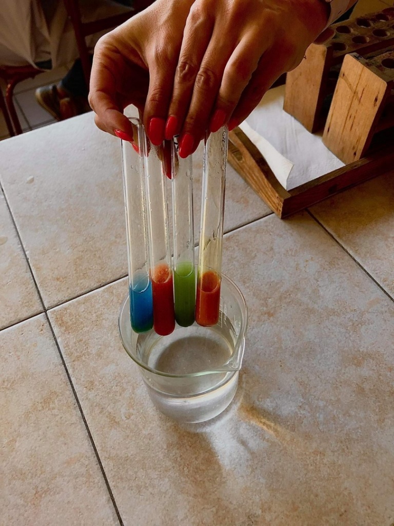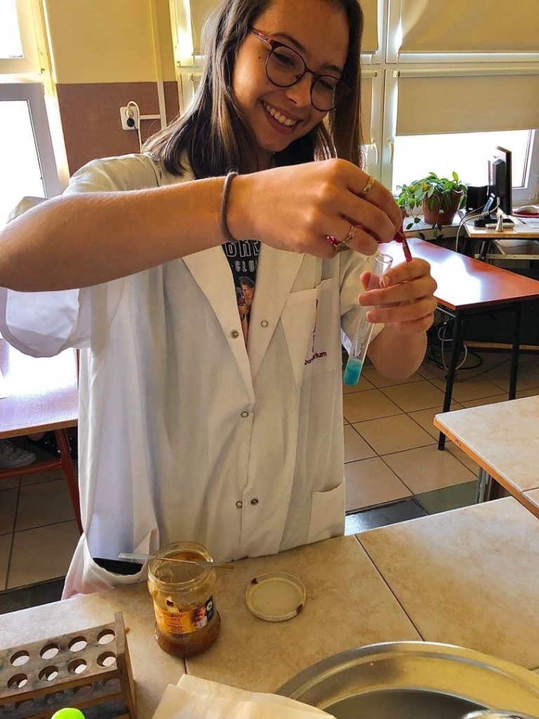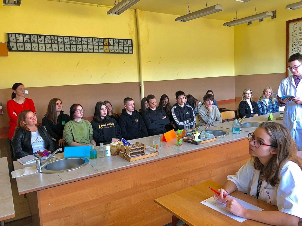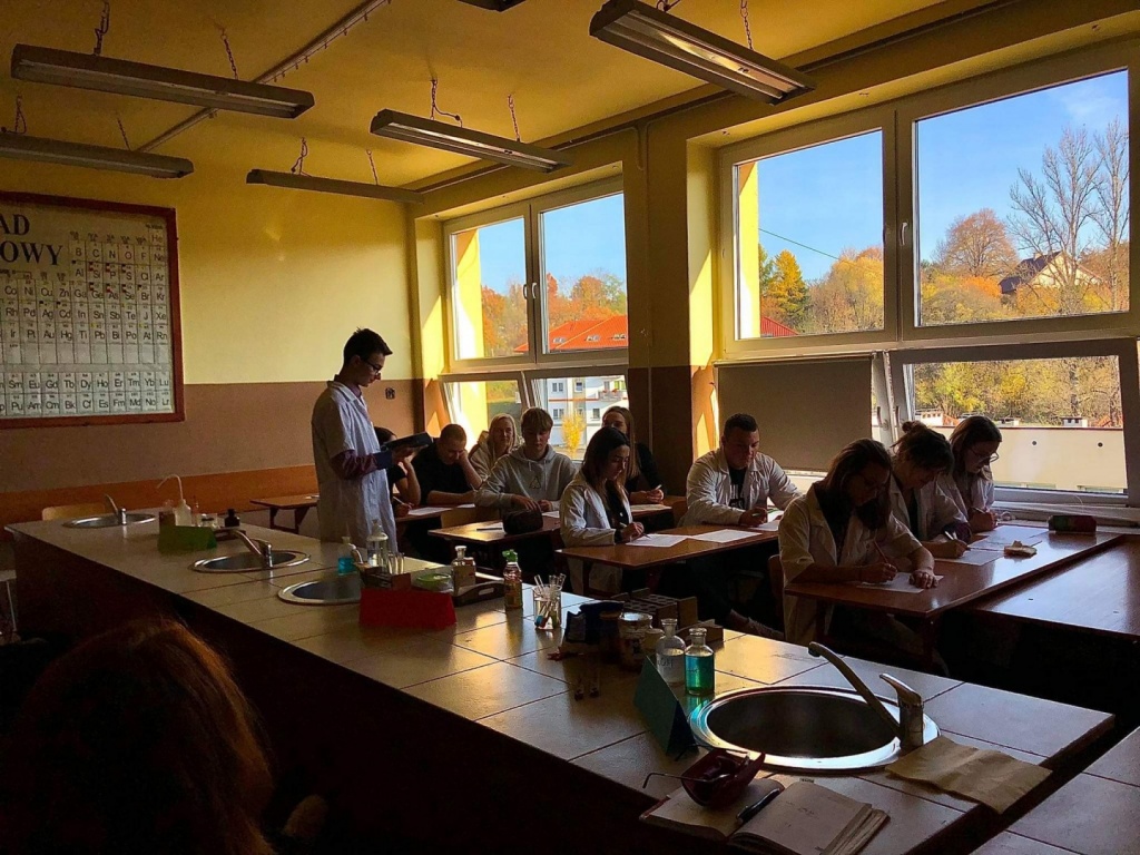 27 października odbyła się w naszej szkole otwarta lekcja chemii w języku angielskim, której temat brzmiał: Review - detection of nutrients in food. Uczniowie klasy 3CO wykonywali trzy różne doświadczenia, które miały na celu wykryć substancje odżywcze w produktach spożywczych. Zademonstrowali następujące doświadczenia: Próbę Trommera, reakcję ksantoproteinową, reakcję biuretową, odróżnianie tłuszczów nasyconych od nienasyconych, wykorzystując odpowiednie odczynniki chemiczne. Uczniowie oraz nauczyciele podczas lekcji posługiwali się wyłącznie językiem angielskim: opisywali wykonywane czynności podczas wykonywania ćwiczeń, obserwacje, wnioski oraz uzupełniali przygotowaną kartę pracy.