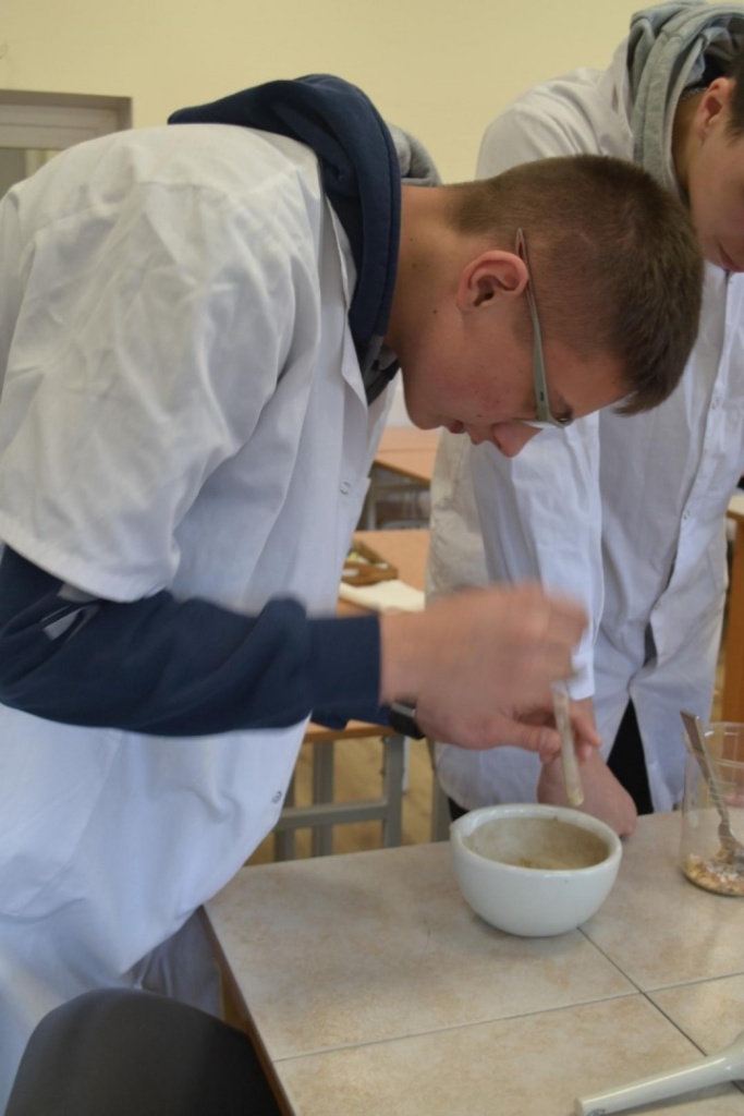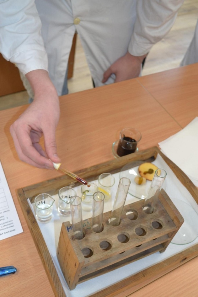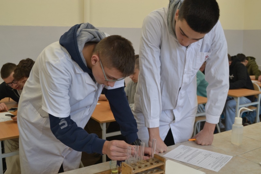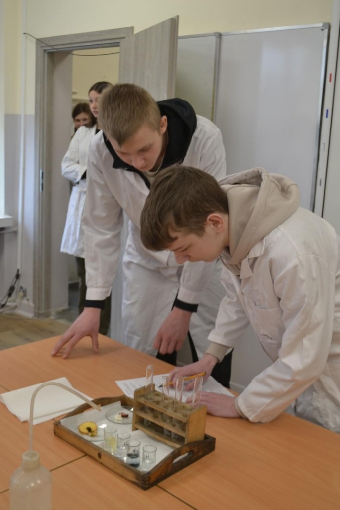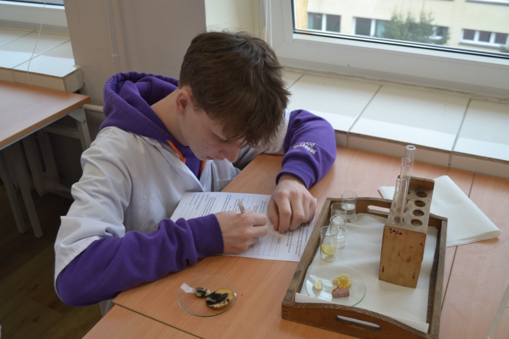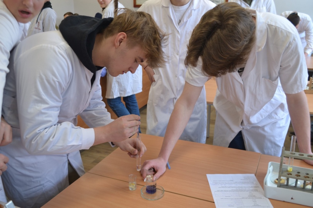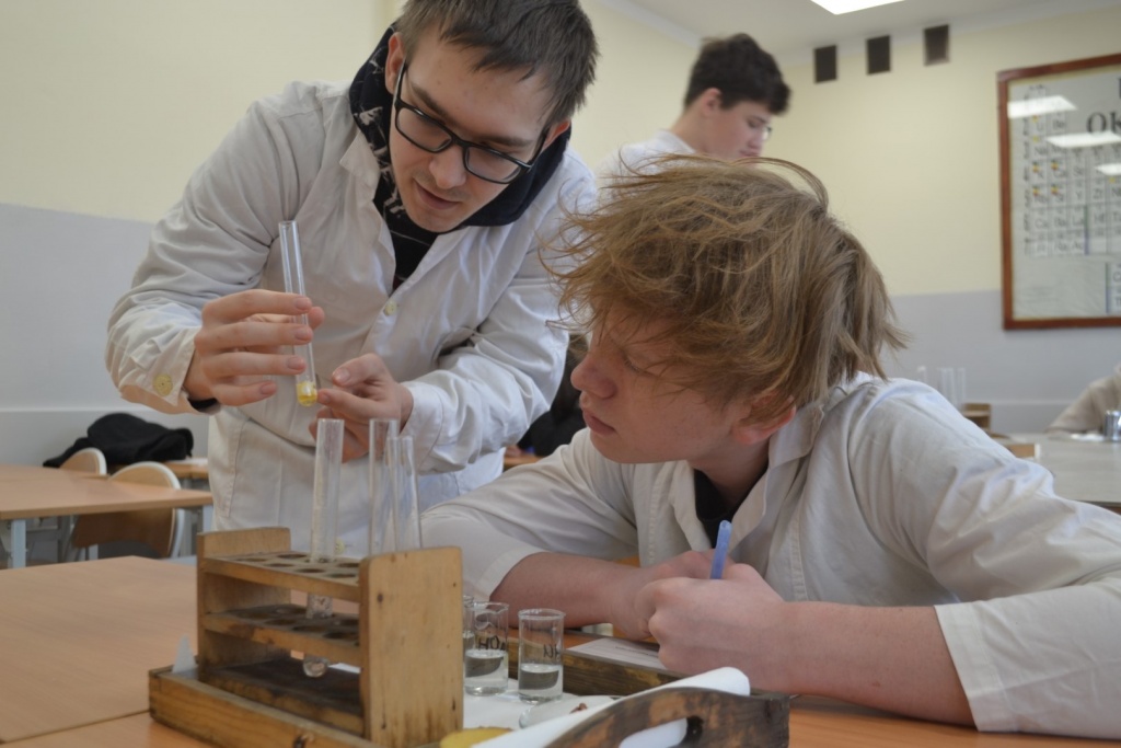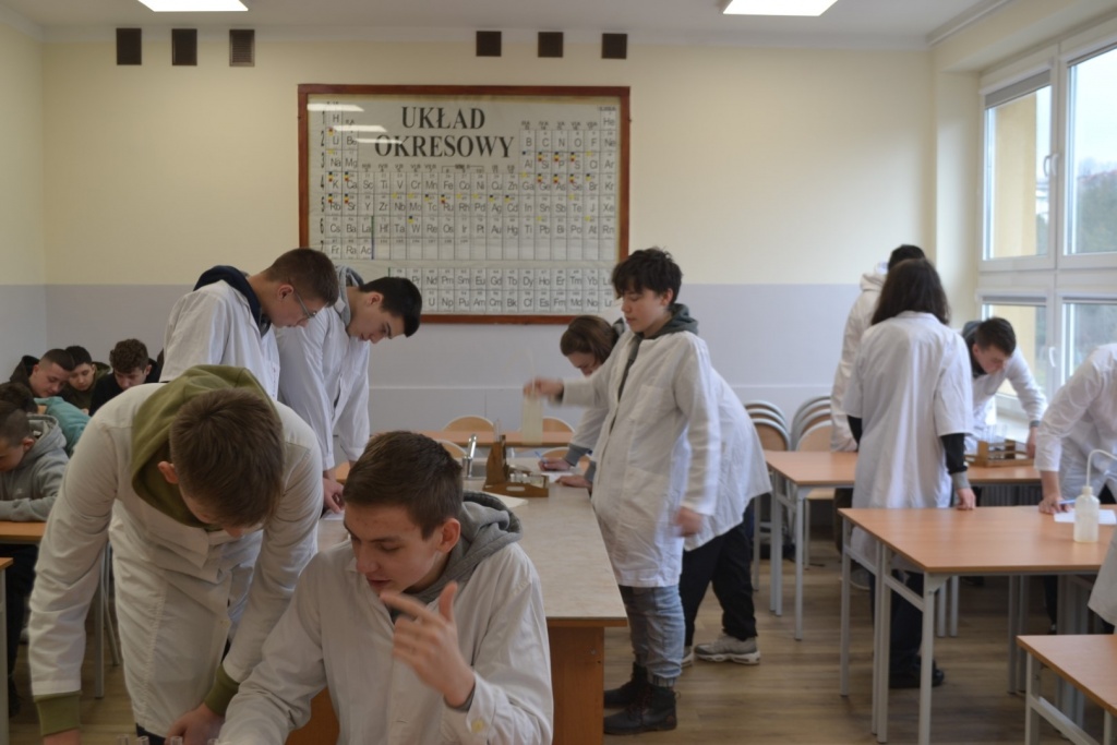 Klasa 2bT wzięła udział w warsztatach biologiczno-chemicznych pod hasłem „Czy wiesz co jesz?”, w trakcie których uczniowie podzieleni na grupy wykrywali związki organiczne w produktach spożywczych. Przy pomocy stężonego kwasu azotowego V badano między innymi czy w białym serze i kiełbasie obecne jest białko. Płyn Lugola z kolei posłużył do wykrywania obecności skrobi w ziemniaku i fasoli. Używając kwasu chlorowodorowego uczniowie sprawdzali czy w skorupkach jaj znajduje się węglan wapnia. Określano także kwasowość i zasadowość roztworów na przykład soku z cytryny za pomocą wywaru z czerwonej kapusty. Produkty spożywcze wykorzystane na warsztatach zostały przygotowane przez uczniów, którzy z dużym zaangażowaniem i precyzją wykonywali wszystkie doświadczenia. Celem warsztatów było pokazanie w jaki sposób można wykorzystać wiedzę z biologii i chemii w życiu codziennym.