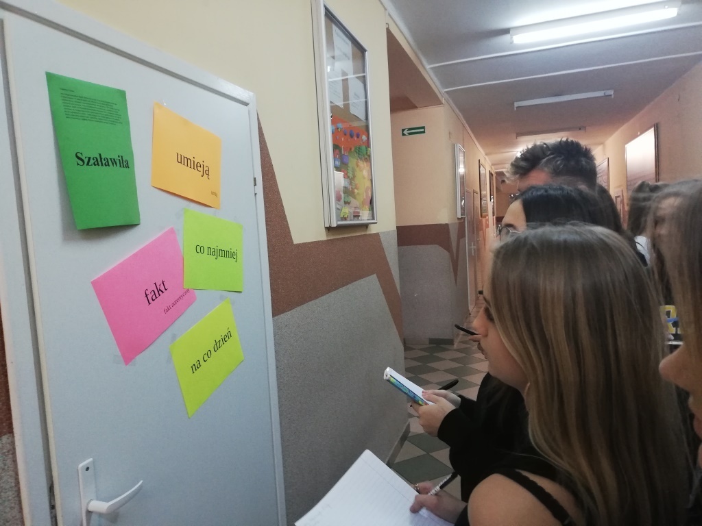 W różnych miejscach w szkole pojawiły się jaskrawo kolorowe kartki informujące np. o tym, że nie „spaźniamy się”, tylko „spóźniamy”, nie ‘włanczamy”, lecz „włączamy”, nie „trzymiemy”, lecz „trzymamy”, nie mówimy „wziąść”, „spadać w dół”, tylko „wziąć”, „spadać”. Mamy nadzieję, że przynajmniej część z tych uwag zostanie zapamiętana przez przechodzących obok i czytających młodych ludzi (tych starszych zresztą też).
