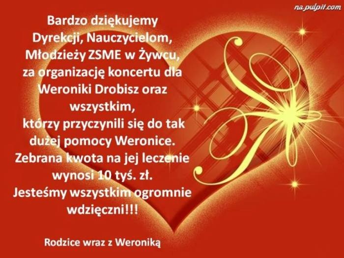 6 grudnia 2018 roku to niezwykły dzień, nie tylko ze względu na mikołajki, większą niż zwykle życzliwość i drobne podarki. Tego dnia ZSM-E pokazało, że potrafi zrobić coś dobrego dla kogoś, kto tej pomocy potrzebuje. W tym dniu wszyscy mieliśmy jeden cel, zebrać jak największą kwotę dla Weroniki Drobisz, trzynastolatki z Żywca, której rodzice z uporem gromadzą fundusze na skomplikowaną operację córki. W szkole odbył się koncert, a właściwie dwa koncerty, na których zaprezentowali się uzdolnieni i chętni do bezinteresownego działania młodzi ludzie. Biletami wstępu były cegiełki, które w całości zostały wykupione przez uczniów, nauczycieli naszej szkoły oraz sponsorów. Dziękujemy wszystkim, dzięki którym mogliśmy zorganizować tę imprezę w myśl hasła: "Pomagając innym, stajesz się bogatszy". Zebraliśmy na rzecz Weroniki kwotę w wysokości 10 tysięcy zł i to jest dla nas wszystkich największy sukces.