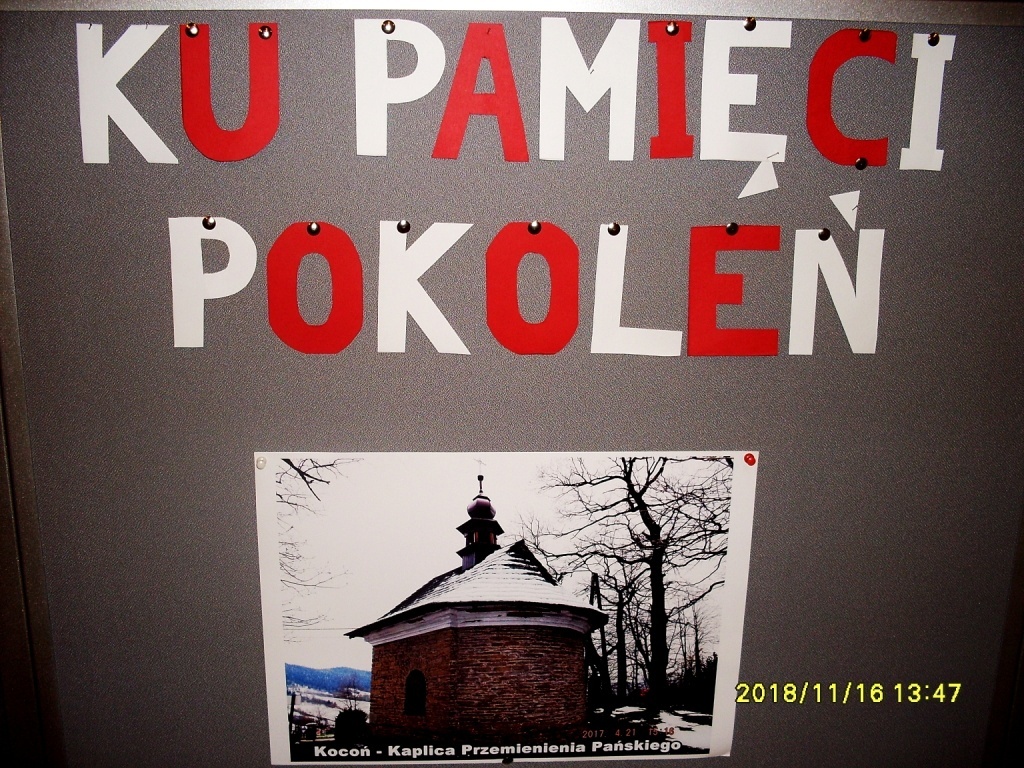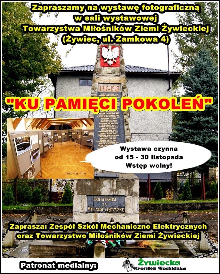 Od 16 listopada 2018 roku, w sali wystaw Towarzystwa Miłośników Ziemi Żywieckiej przy ulicy Zamkowej 4 w Żywcu, zobaczyć można kolejną z wystaw fotograficznych, przygotowaną przez uczniów ZSM-E w Żywcu. Ekspozycja zatytułowana „Ku pamięci pokoleń” prezentuje tym razem tematykę związaną z walką o niepodległość narodu polskiego. Kolekcja przedstawia miejsca pamięci narodowej (pomniki, kapliczki oraz obeliski i tablice pamiątkowe) zlokalizowane na terenie Żywiecczyzny, które przypominają o długiej i dramatycznej walce narodu polskiego o odzyskanie niepodległości. Zwiedzający mogą obejrzeć fotografie przedstawiające m.in.: obelisk w Kocierzu Rychwałdzkim upamiętniający miejsca walki i męczeństwa żołnierzy AK na Żywiecczyźnie, kwatery żołnierzy i legionistów z I i II w. św. na Cmentarzu Przemienienia Pańskiego w Żywcu, czy Kaplicę Przemienienia Pańskiego w Koconiu - postawioną, aby uczcić stulecie konfederacji barskiej.