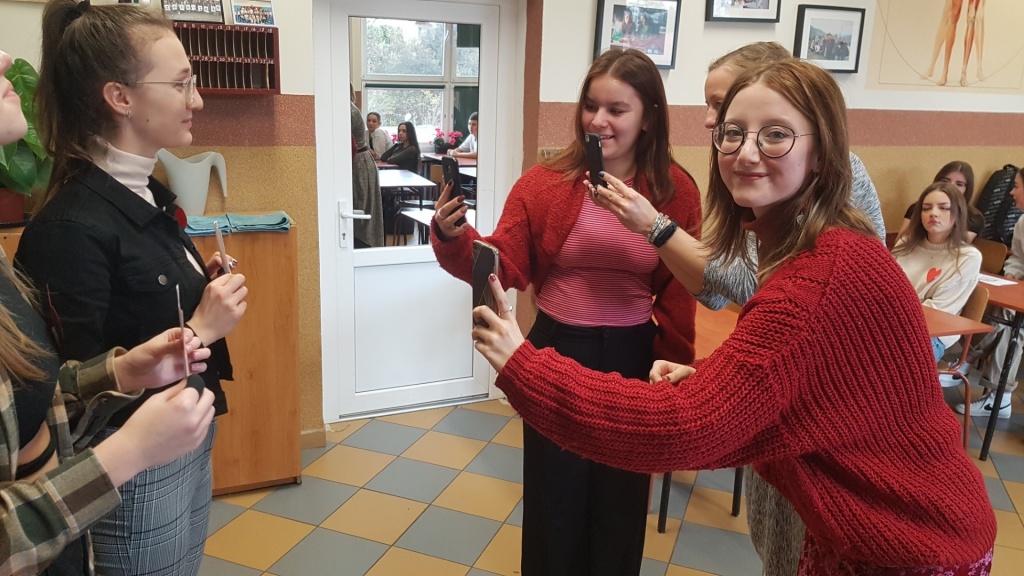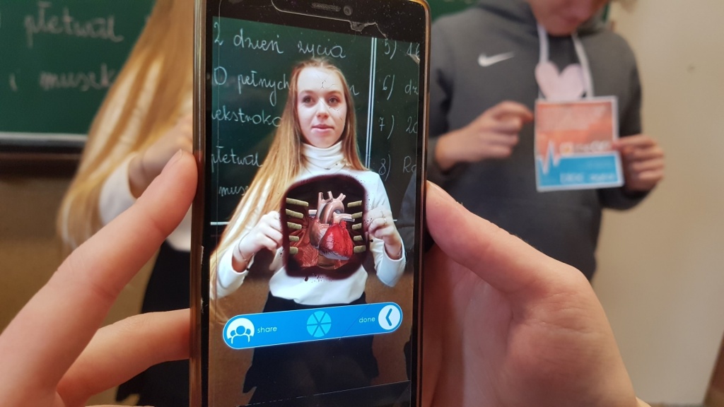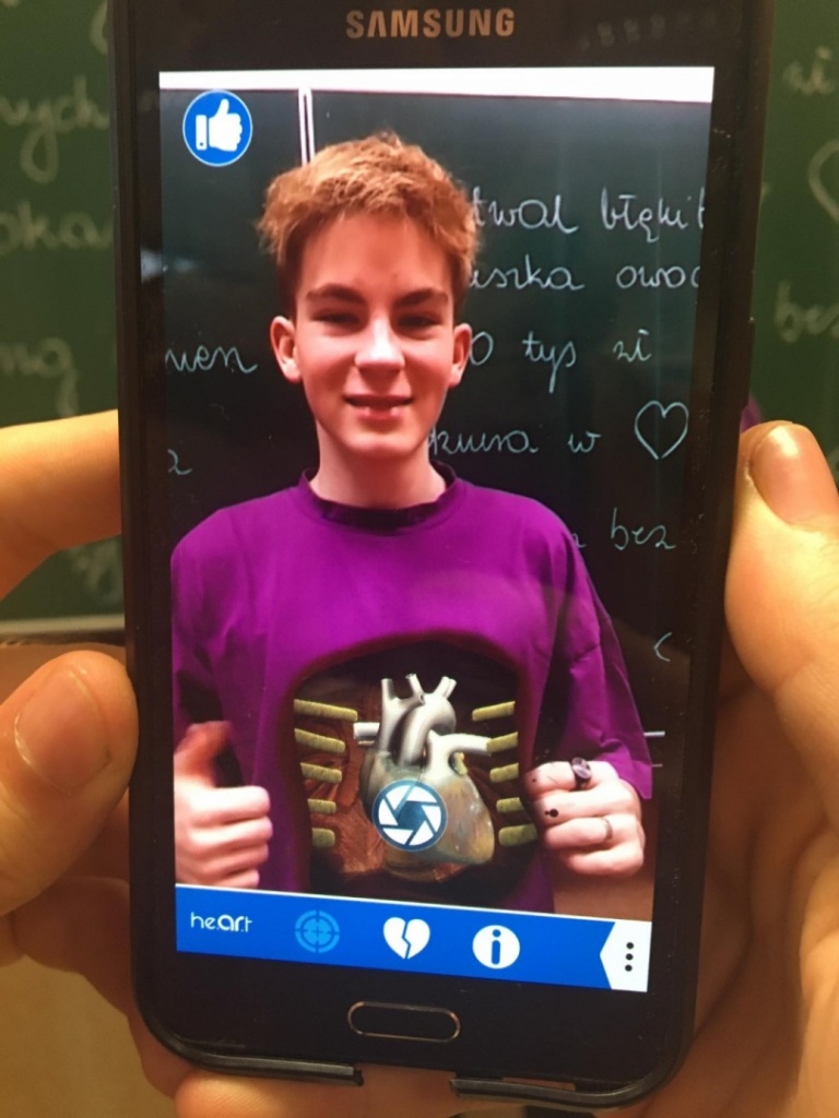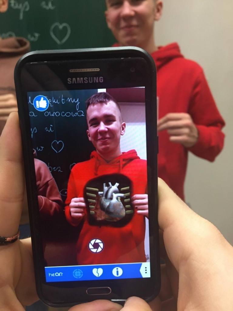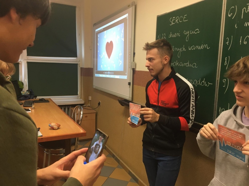 Kolejną atrakcją było przedstawienie i omówienie polskich przysłów nawiązujących do lekcji. Najwięcej radości dostarczyło klasom zakończenie lekcji, podczas którego wszyscy mogli zobaczyć, jak wygląda i pracuje ludzkie serce. Uczniowie w parach oglądali poprzez aplikację realistyczny model narządu, który wyświetlał się dzięki specjalnej karcie.