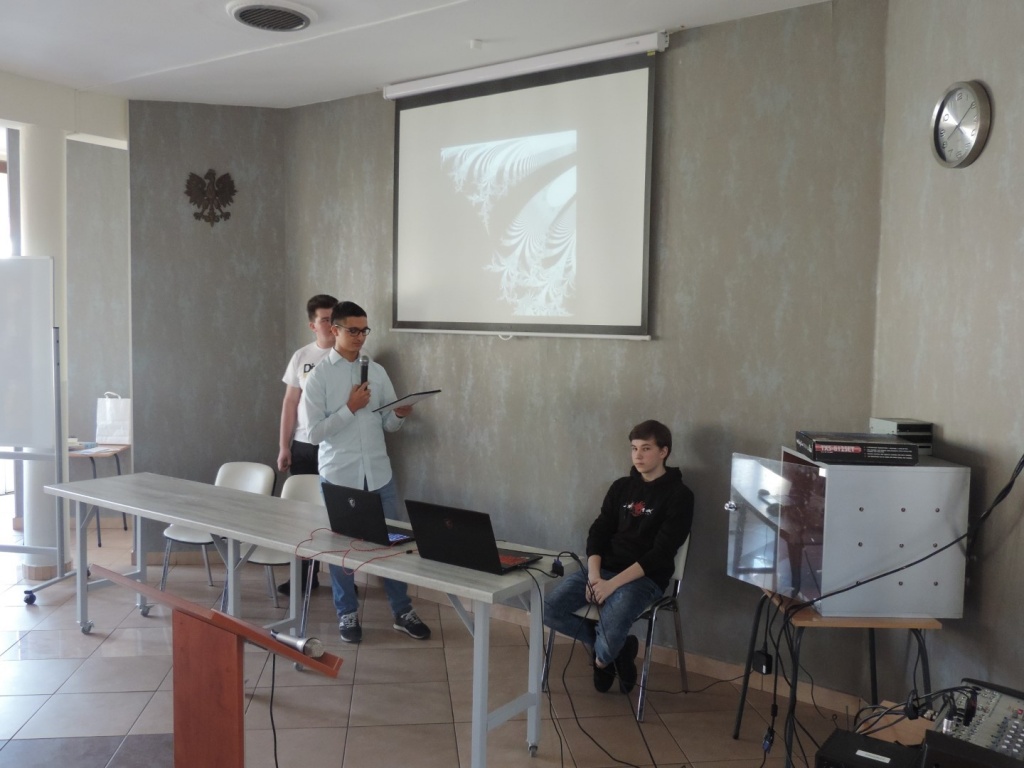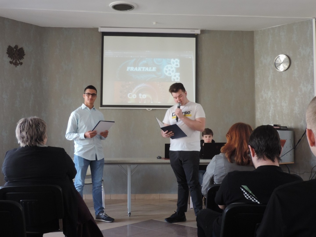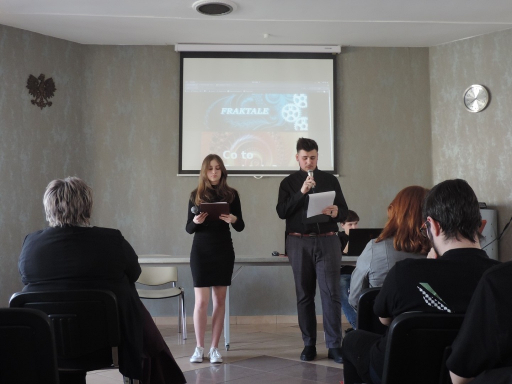 Jako pierwsi zaprezentowali się informatycy. Uczniowie z klasy 3ct wyjaśnili, czym są fraktale i gdzie można je odnaleźć. Ciekawym elementem był pokaz fraktali w grze komputerowej Garry’s mod, w której za pomocą podmiany tekstur obiektów można wygenerować fraktal. Punktem kulminacyjnym ich wystąpienia był program napisany w języku C++, który rysował fraktal. Z kolei uczniowie klas 3et oraz 3atg przekonali nas o istnieniu nierozerwalnego związku matematyki z fizyką. I tak: Michał Mucha i Jan Habdas przedstawili bardzo ciekawą pracę pt. „Jak zważyć ziemię” a Michał Tanistra i Igor Dudys zaprezentowali projekt pt: „Stałe w fizyce”. Utwierdzili nas w przekonaniu, że każdą relację między odpowiednimi wielkościami fizycznymi można zawsze wyrazić matematycznie. Dopełnieniem pokazów okazała się prezentacja Mateusza Węglewskiego pt. „Kryptografia jako nauka o metodach kodowania i szyfrowania informacji”.
