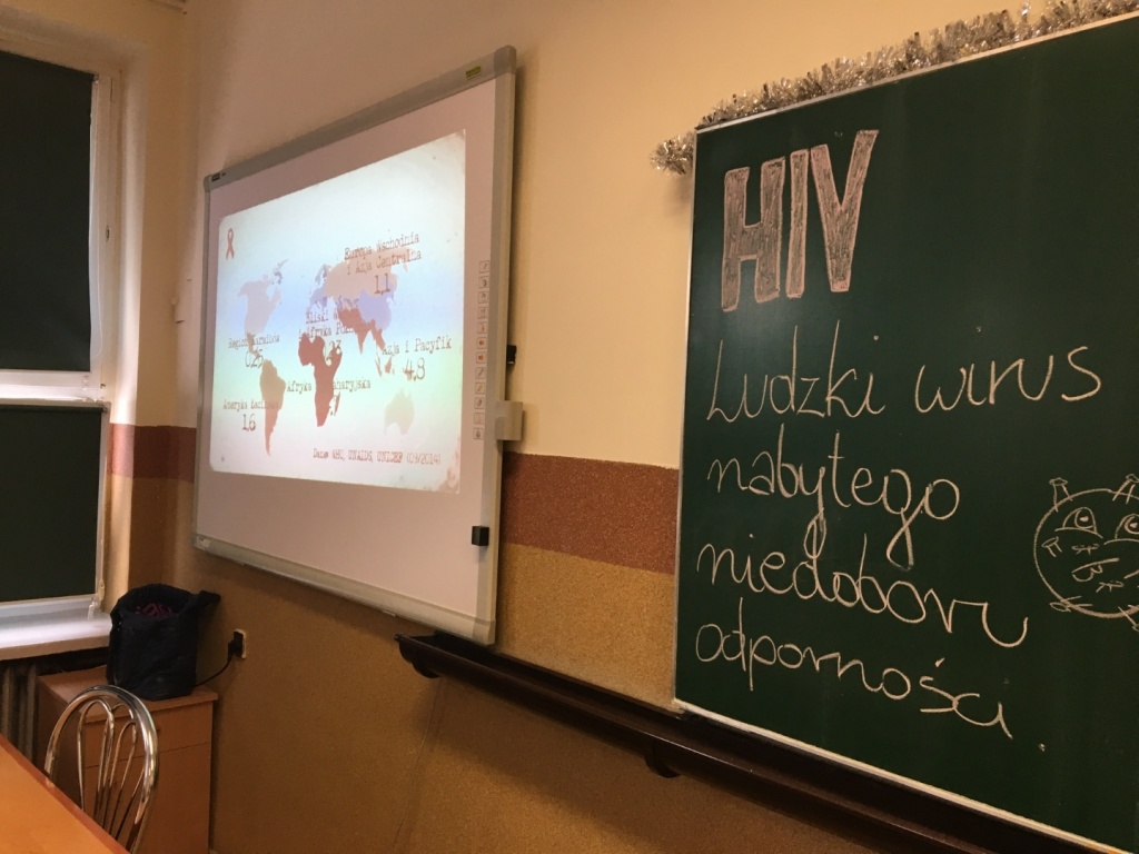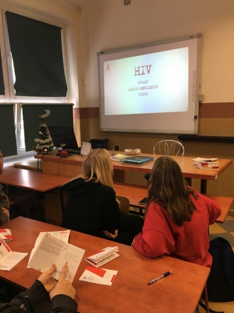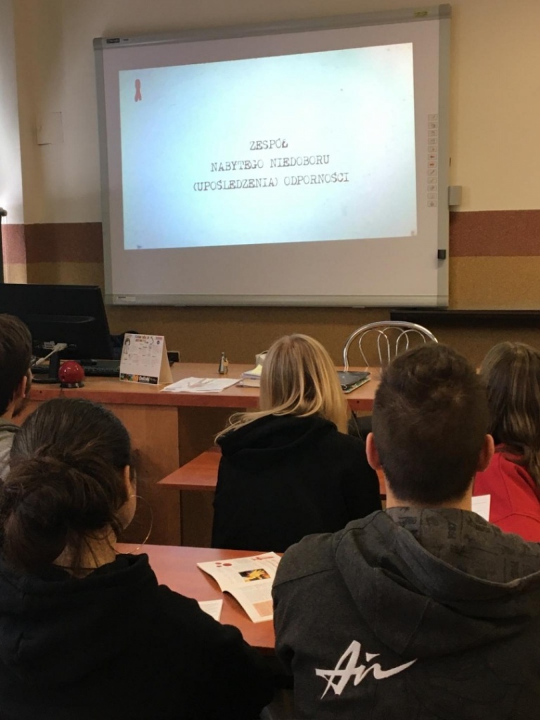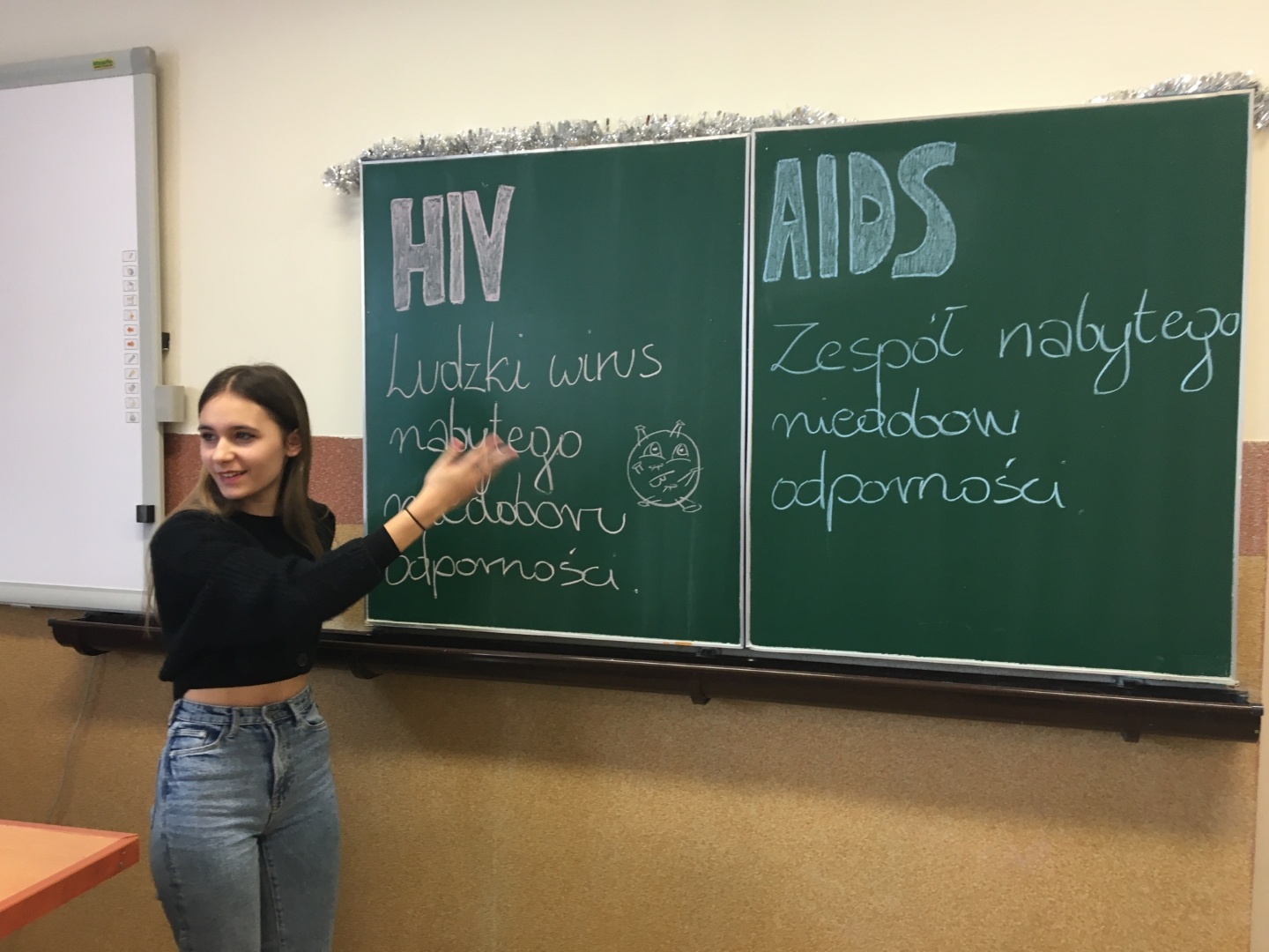 Klasa 2aLO w ramach przedmiotu Anatomia i fizjologia człowieka wzięła udział w lekcji profilaktycznej realizowanej w ramach projektu „Nie daj się HIV – zapobiegaj zakażeniu”. Podczas zajęć uczniowie poznali budowę i patofizjologię wirusa HIV, nauczyli się rozróżniać skróty: HIV/AIDS oraz wzięli udział w quizie: fakty i mity na temat AIDS. Uzupełnieniem lekcji była projekcja filmu „AIDS – epidemia wciąż niepokonana”, który uświadomił młodzieży, że na ryzyko zakażenia HIV narażeni mogą być wszyscy bez względu na wiek, płeć, orientację seksualną, religię i rasę. W kolejnej części zajęć uczniowie pracowali w grupach korzystając z publikacji „Co musisz wiedzieć o HIV i AIDS” i prezentowali informacje między innymi na temat: HIV/AIDS a udzielanie pierwszej pomocy czy występowanie HIV/AIDS u dzieci. W ramach podsumowania zajęć uczniowie rozwiązali krzyżówkę dotyczącą omówionych treści. Młodzież zobowiązała się również do wykonania zadania domowego, które polegało na rozmowie ze starszą osobą w swojej rodzinie na temat ryzyka zakażenia HIV. Prelekcję zorganizowała Anna Sawicka.