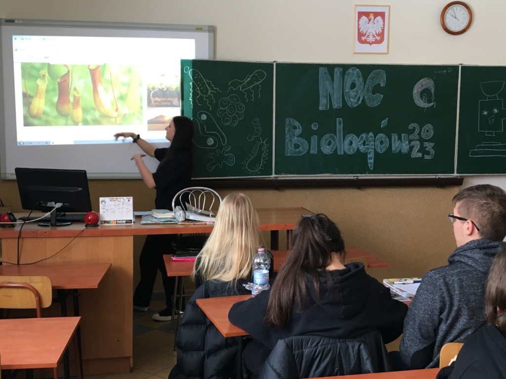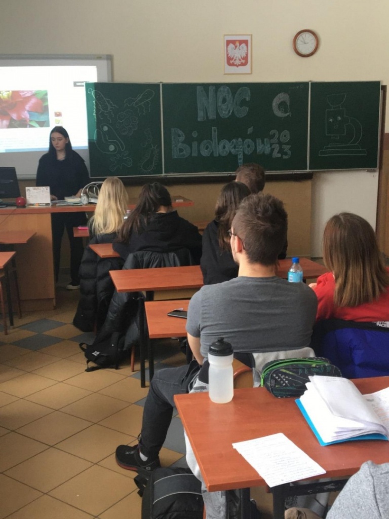 Klasa 2aLO po raz kolejny wzięła udział w ogólnopolskim wydarzeniu „Noc Biologów”. W tym roku tematem przewodnim wykładów i warsztatów było hasło: „Woda źródło życia - teraźniejszość i przyszłość”. Organizatorem przekazu online był Wydział Biologii Uniwersytetu Warszawskiego. Uczniowie wysłuchali ciekawych wykładów, między innymi: Jak rośliny „piją”, czyli transport wody w roślinach, W symbiozie z wodą – kilka słów o mchach, Dlaczego koty spadają do wody - czyli jak i po co śpimy, Fascynujący świat pasożytów. Młodzież miała za zadanie streścić jeden wybrany wykład i zaprezentować swoją wiedzę w formie krótkiej prezentacji na lekcji biologii.
