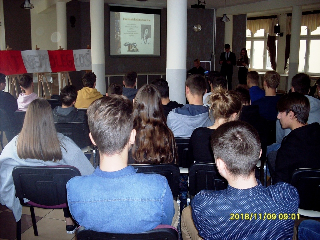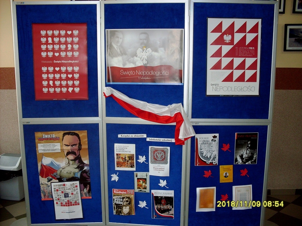 Dokładnie 100 lat temu, 11 listopada 1918 roku, po 123 latach zaborów Polska odzyskała niepodległość. Obchody tak ważnego dla wszystkich Polaków Święta Narodowego nie mogły ominąć naszej szkoły. Z tej okazji panie bibliotekarki przygotowały wystawę tematyczną upamiętniającą wydarzenia i postacie związane z odzyskaniem przez Polskę wolności. Ponadto, uczniowie klas pierwszych i trzecich mieli okazję posłuchać prelekcji przygotowanej pod czujnym okiem pana Rafała Harańczyka. Z kolei z inspiracji pana Leszka Szpili na pierwszym piętrze punktualnie o 11:11 wybrzmiały mocno i głośno polskie pieśni patriotyczne, począwszy od Mazurka Dąbrowskiego. Gratulujemy wszystkim, dzięki którym ten szczególny dzień został w odpowiedni sposób uczczony.