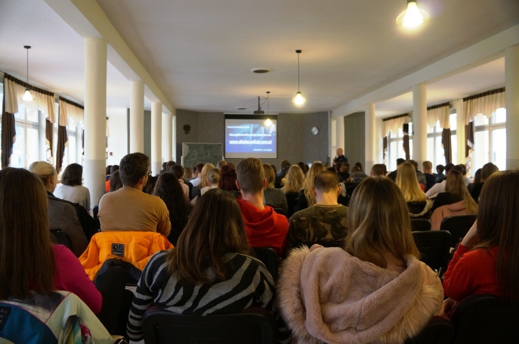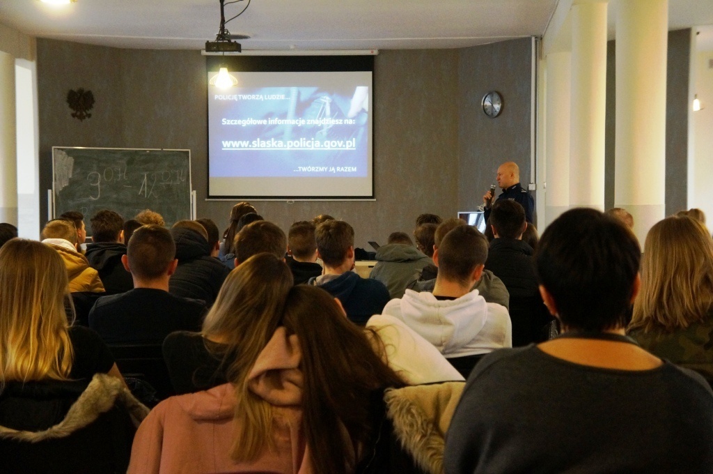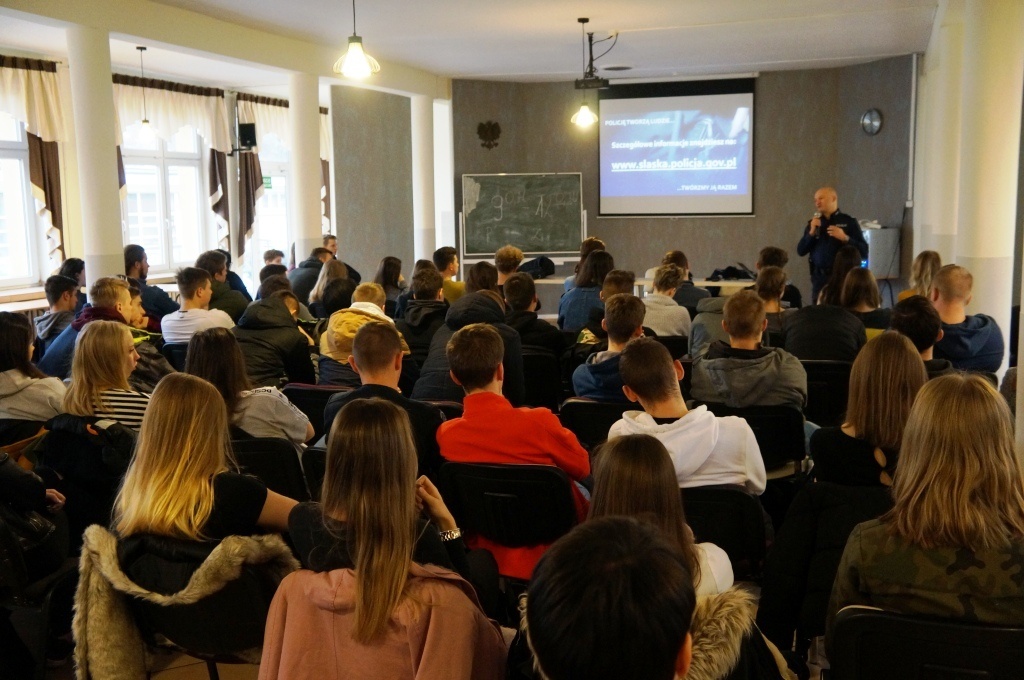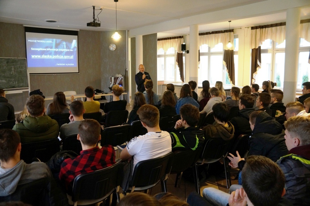 27 listopada 2018 r. odbyło się spotkanie Komendanta Powiatowego Policji w Żywcu, mł. insp. Michała Łukasika i Oficera prasowego KPP asp. szt. Mirosławy Piątek z młodzieżą mechanika. Spotkanie zorganizowano w ramach kampanii „Policję tworzą ludzie….Twórzmy ją razem”. Skierowane było do klas maturalnych. Młodzież miała okazję zobaczyć, jak na co dzień wygląda policyjna służba (projekcja filmu) oraz zapoznać się z poszczególnymi etapami rekrutacji do służby w Policji. Policjanci szczegółowo przedstawili każdy z etapów, jaki musi przejść kandydat. Podkreślili również, że praca w Policji daje wiele możliwości, a przede wszystkim satysfakcję ze służby drugiemu człowiekowi.