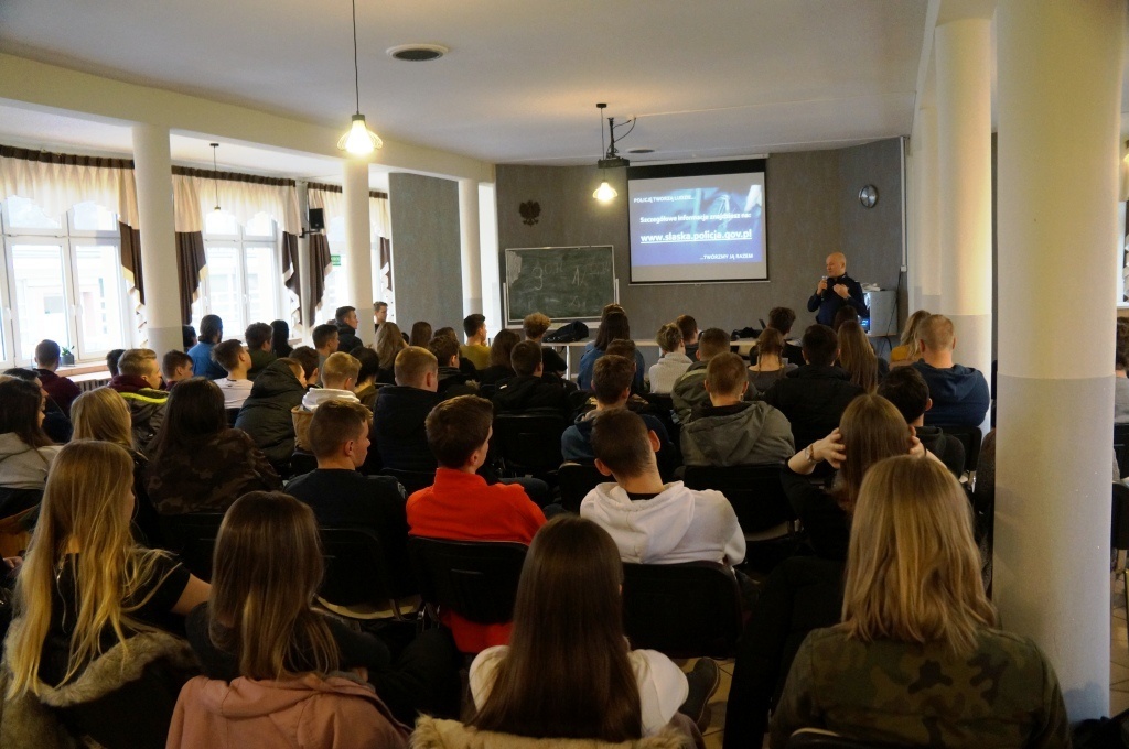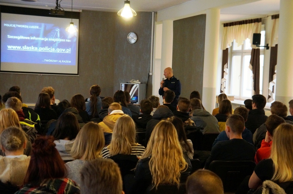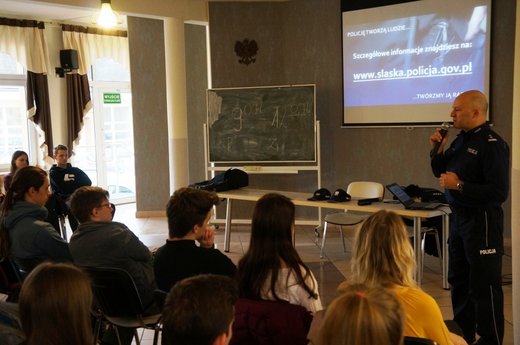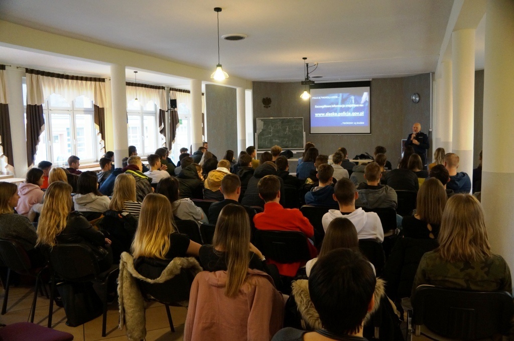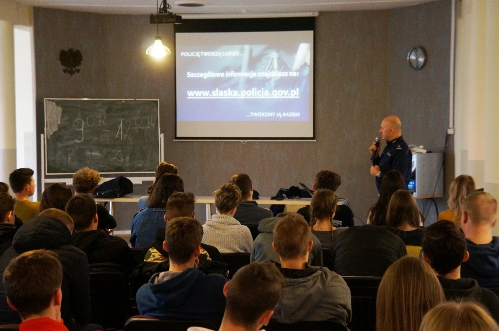 27 listopada 2018 r. odbyło się spotkanie Komendanta Powiatowego Policji w Żywcu, mł. insp. Michała Łukasika i Oficera prasowego KPP asp. szt. Mirosławy Piątek z młodzieżą mechanika. Spotkanie zorganizowano w ramach kampanii „Policję tworzą ludzie….Twórzmy ją razem”. Skierowane było do klas maturalnych. Młodzież miała okazję zobaczyć, jak na co dzień wygląda policyjna służba (projekcja filmu) oraz zapoznać się z poszczególnymi etapami rekrutacji do służby w Policji. Policjanci szczegółowo przedstawili każdy z etapów, jaki musi przejść kandydat. Podkreślili również, że praca w Policji daje wiele możliwości, a przede wszystkim satysfakcję ze służby drugiemu człowiekowi.