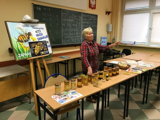 9 listopada klasy 2aLO i 3fT wzięły udział w prelekcji połączonej z pokazem pt. ”Złoty cud natury, czyli jak powstaje miód”. W trakcie spotkania, prowadzonego przez Panią Krystynę Walas - przewodnika beskidzkiego i znawczynię pszczelarstwa, uczniowie zapoznali się z etapami powstawania różnych rodzajów miodu. Uczestnicy wykładu poznali również budowę, niezwykłe umiejętności i sposoby zachowania się pszczół. Prowadząca w bardzo interesujący sposób opowiedziała o produktach, które oprócz miodu pochodzą z ula, a należą do nich: mleczko pszczele, pyłek kwiatowy, wosk, pierzga i propolis oraz o ich dobroczynnym działaniu na organizm człowieka. Uczniowie dowiedzieli się także w jaki sposób wykorzystuje się jad pszczeli w medycynie.