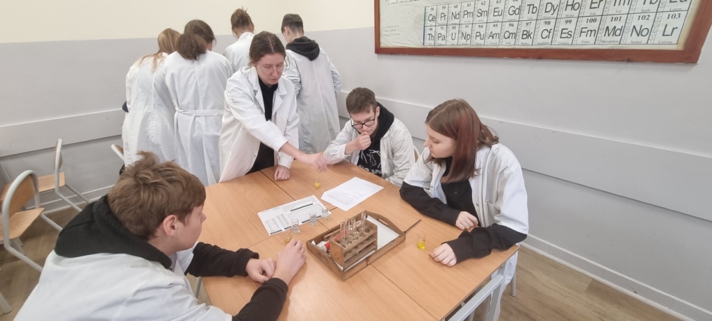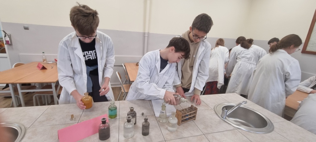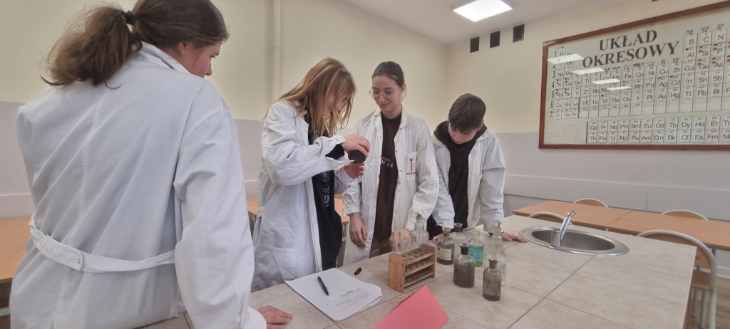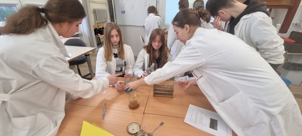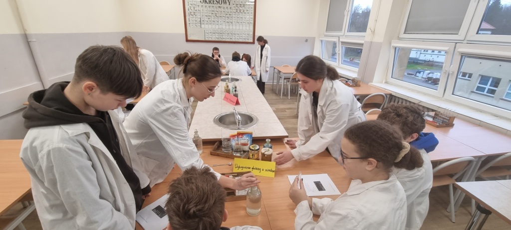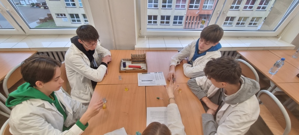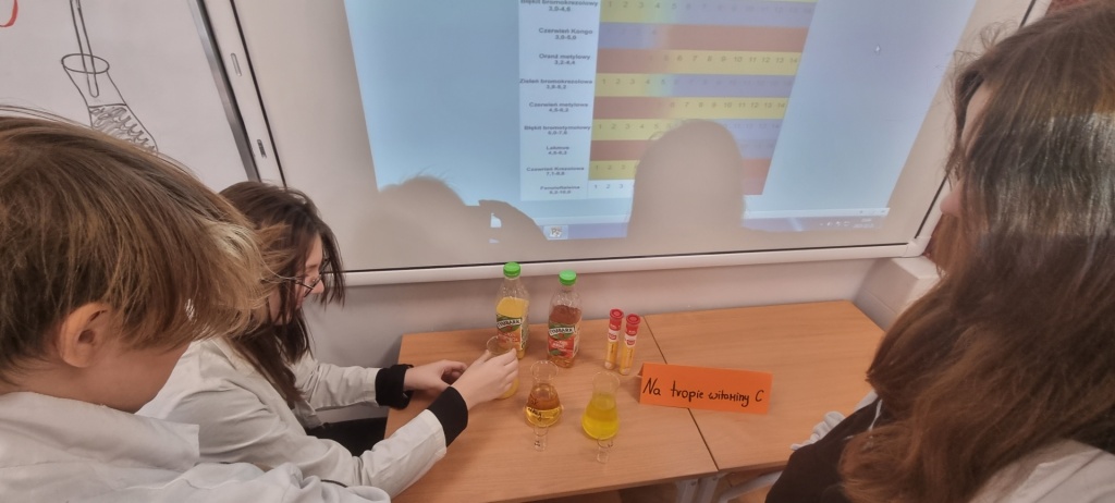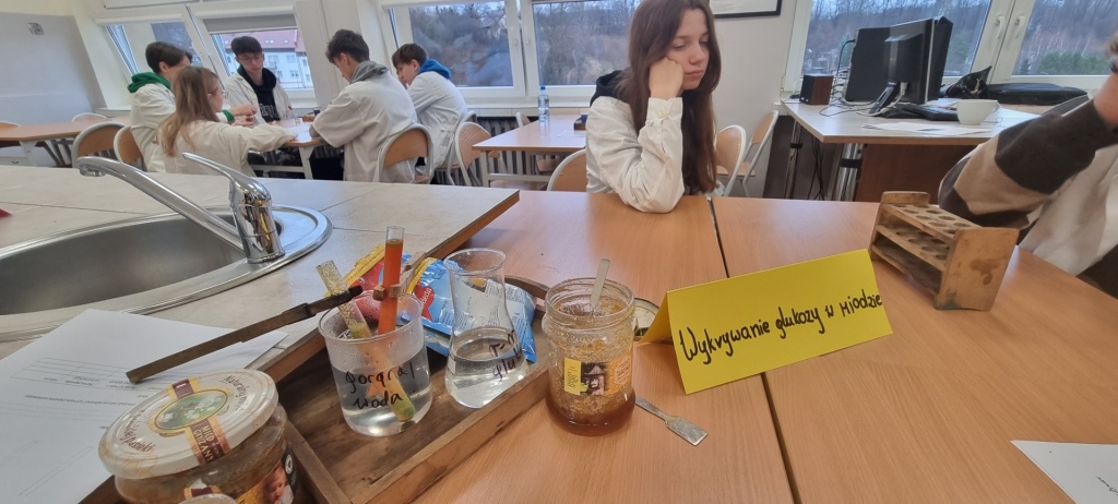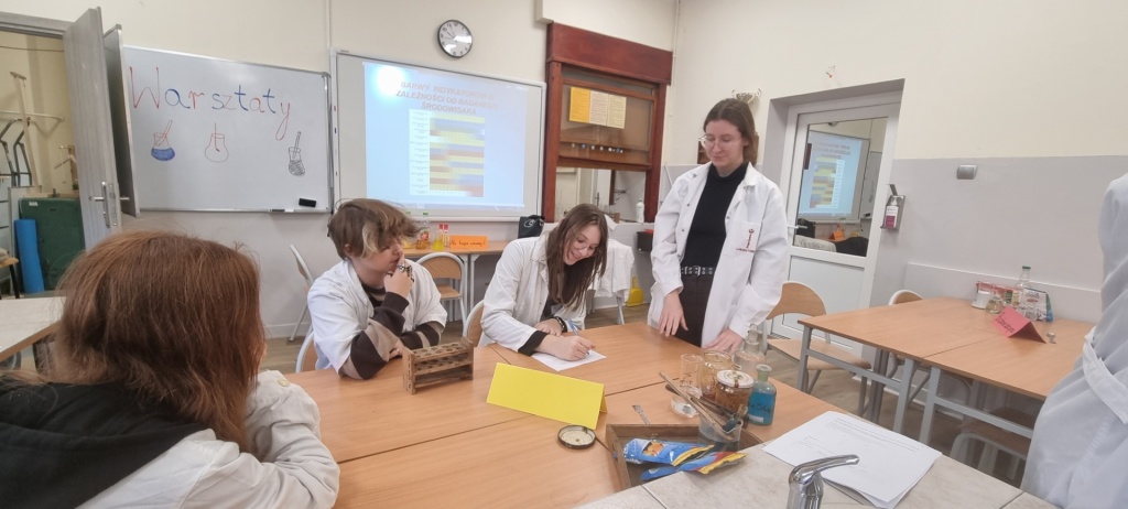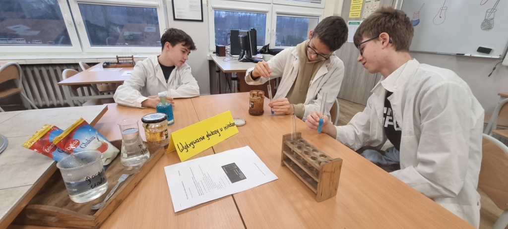 Zajęcia polegały na samodzielnym wykonywaniu doświadczeń chemicznych. Nasi goście mogli przekonać się czy w miodzie i cukrze pudrze faktycznie występuje glukoza? Wykonać barwne reakcje strąceniowe, sprawdzić ilość witaminy C w poszczególnych produktach spożywczych oraz zbadać zmiany zabarwienia wywary z czerwonej kapusty w zależności od odczynu roztworu.