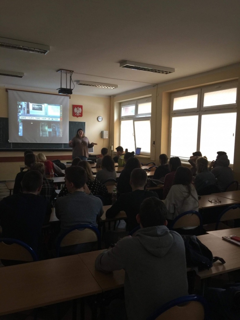 21. lutego klasa 2aLO wzięła udział w warsztatach, organizowanych przez panią Agnieszkę Biegun, studentkę kultury mediów na Uniwersytecie Śląskim. Była to okazja do poznania historii kinematografii, wielu ciekawostek na temat montażu, obejrzenia pierwszych krótkometrażowych filmów oraz włączenia się w dyskusję na temat różnych gatunków filmowych, zarówno tych starszych jak i współczesnych. Prelekcja była oparta na prezentacji scen filmowych, co sprawiło, że uczniowie oglądali ją z dużym zaciekawieniem. Wiele przykładów i motywów z prezentowanych scen z pewnością przyda nam się na maturze.