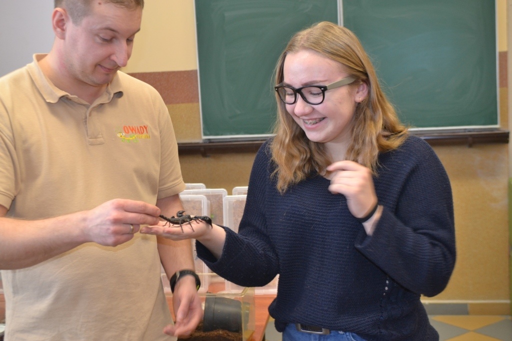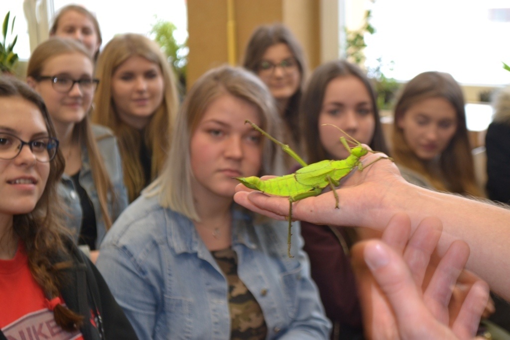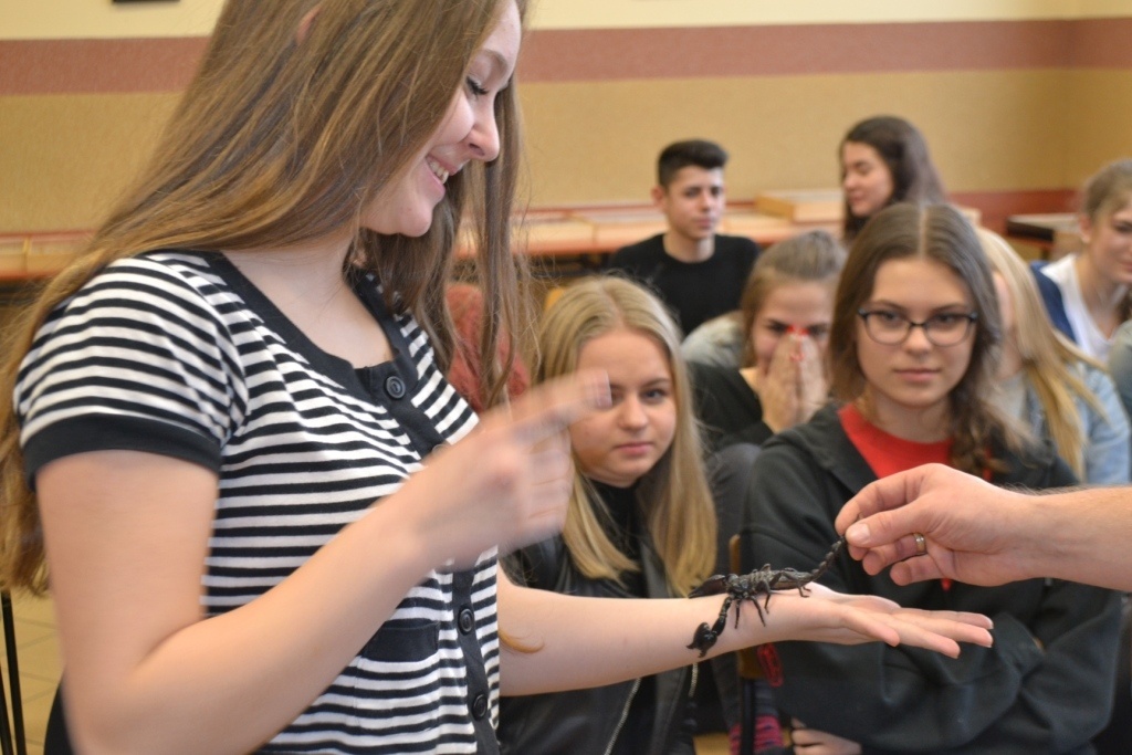 W dniu 8 stycznia klasa 1a LO wzięła udział w warsztatach przyrodniczych pt. „STAWONOGI”. W trakcie trwających 1,5 godziny zajęć uczniowie obejrzeli mobilne muzeum motyli, obejmujące 25 gablot z motylami z całego świata, w tym największe ćmy i ponad 100 gatunków polskich motyli dziennych oraz bogatą kolekcję motyli tropikalnych. W drugiej części warsztatów uczniowie wzięli udział w prezentacji żywych gatunków pajęczaków, wśród których znalazły się ptaszniki i skorpiony. Młodzież zapoznała się również z budową ich ciała oraz sposobami życia. Najodważniejsi uczestnicy spotkania mieli również niepowtarzalną okazję bezpośredniego kontaktu z niektórymi gatunkami. Podczas ostatniej części zajęć prowadzący dokonał prezentacji i opisu kilkunastu żywych gatunków straszyków i patyczaków oraz opowiedział o ich funkcjach życiowych. Warsztaty przyczyniły się do pogłębienia wiedzy uczniów na temat stawonogów oraz dostarczyły uczestnikom niezapomnianych wrażeń. Organizatorem była pani Anna Sawicka.