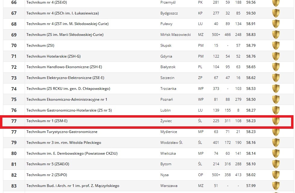 Już po raz 25 miesięcznik "Perspektywy"ogłosił ranking najlepszych szkół ponadpodstawowych. Jesteśmy dumni, że ZSM-E po raz kolejny został nagrodzony Złotą Tarczą i znalazł się w gronie najlepszych szkół w Polsce. Uzyskaliśmy 7 miejsce w województwie śląskim i 77 w kraju. Żywiecki Mechanik jest liderem szkół średnich na Żywiecczyźnie, dzięki wynikom egzaminów maturalnych i zawodowych oraz dzięki osiągnięciom w olimpiadach i konkursach przedmiotowych, uzyskanym przez uczniów w ubiegłym roku. Warto nadmienić, że tym roku wyróżniliśmy się 100% zdawalnością matur. Wśród szkół technicznych otrzymaliśmy w maturalnym rankingu ogólnopolskim bardzo wysokie 33 miejsce w kraju. Gratulujemy i dziękujemy naszym absolwentom!