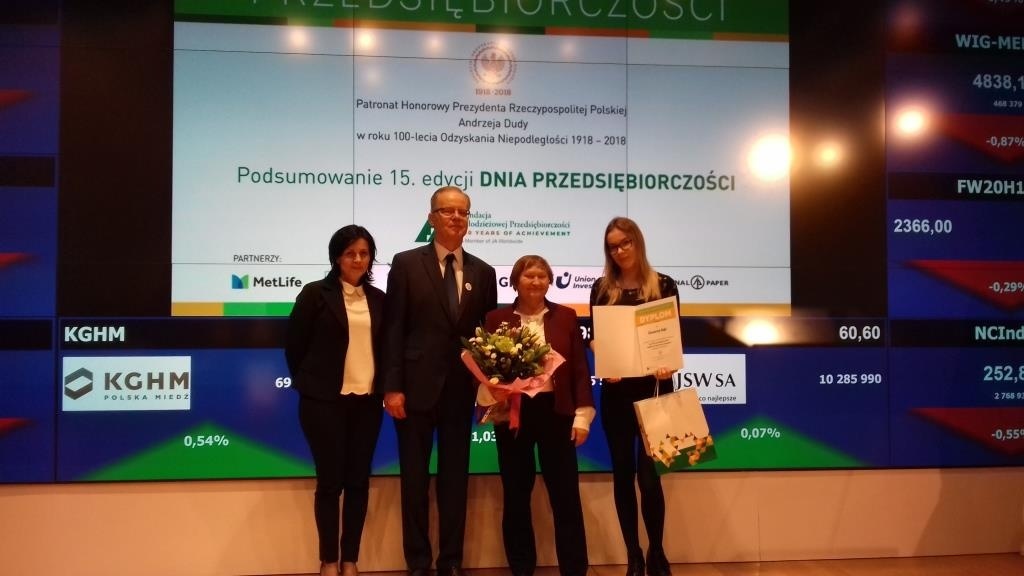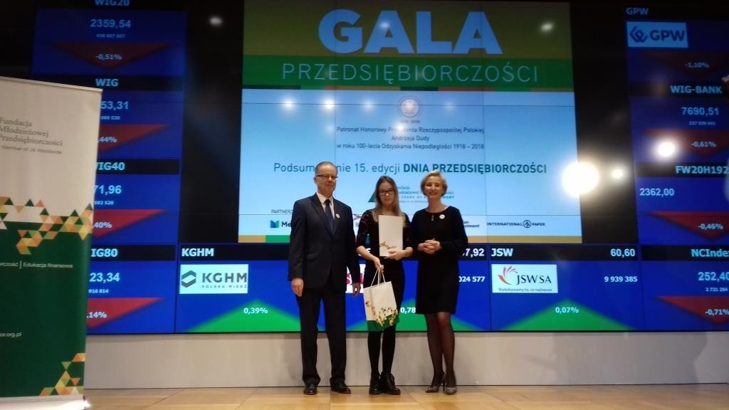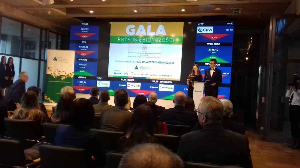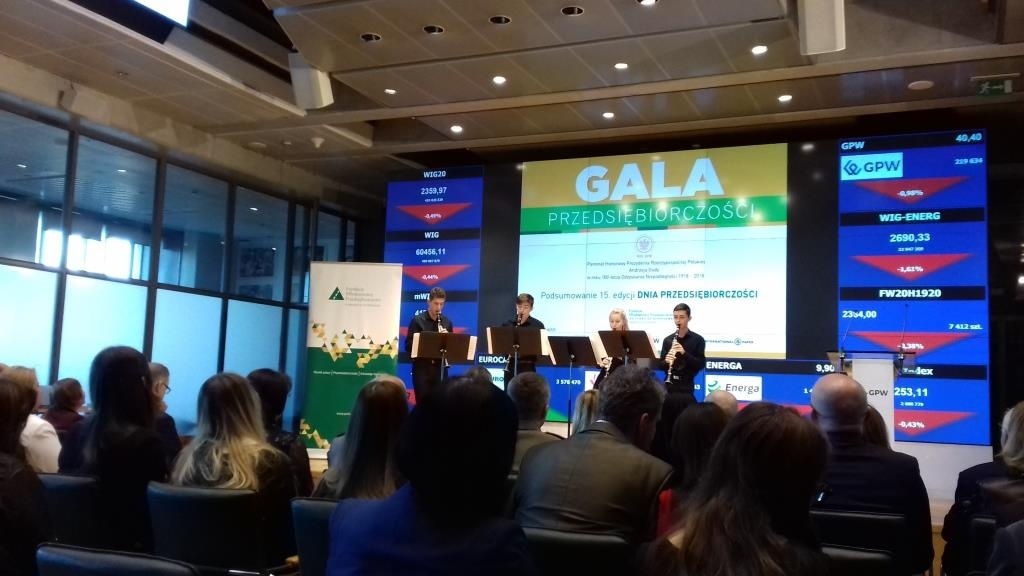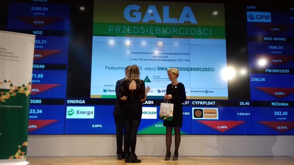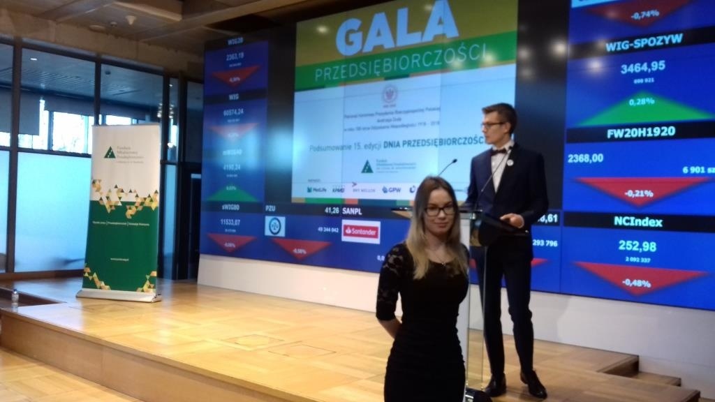 26 lutego w Sali Notowań Giełdy Papierów Wartościowych w Warszawie odbyła się Gala Przedsiębiorczości podsumowująca 15 edycję Dnia Przedsiębiorczości organizowanego przez Fundację Młodzieżowej Przedsiębiorczości pod honorowym patronatem Prezydenta RP Andrzeja Dudy.