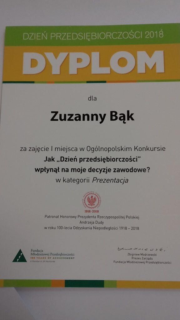 Tym bardziej cieszy fakt, że wśród nagrodzonych znalazła się również uczennica naszej szkoły ZUZANNA BĄK z klasy IIa LO, która zajęła I miejsce w Ogólnopolskim Konkursie „Jak Dzień przedsiębiorczości wpłynął na moje decyzje zawodowe?” w kategorii: Prezentacja . Nagrodę odebrała z rąk samego prezesa Fundacji oraz Pani Małgorzaty Popielawskiej zastępcy prezesa Fundacji.