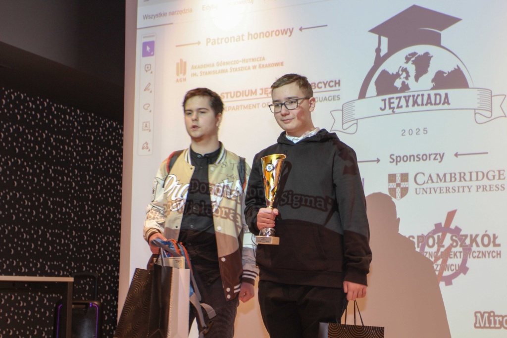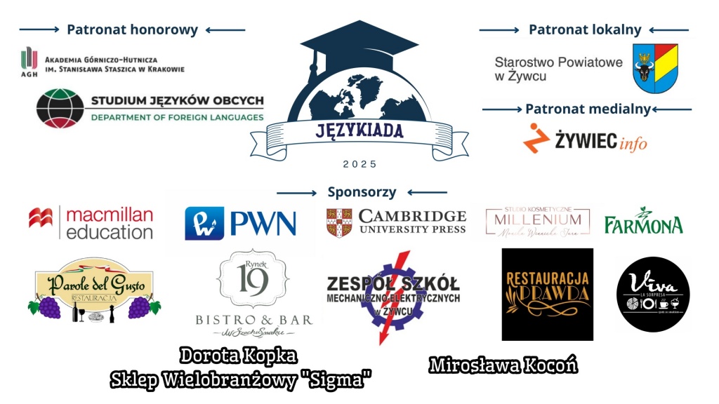 Pragniemy jeszcze raz podziękować Studium Języków Obcych Akademii Górniczo-Hutniczej w Krakowie, a w szczególności Pani Dyrektor Annie Krukiewicz-Gacek za objęcie honorowym patronatem naukowym Językiady Żywieckiej 2025 oraz Panu Staroście Adrianowi Midorowi za ufundowanie pucharów dla laureatów.