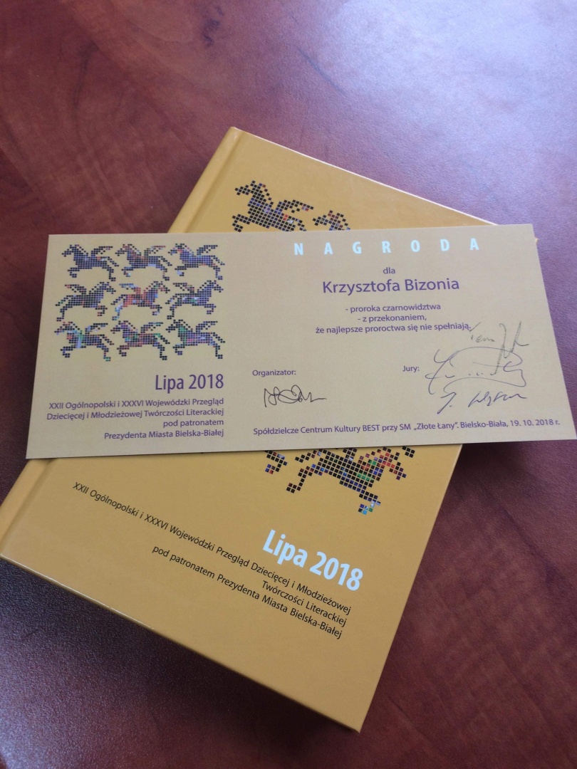 Krzysiek Bizoń, uczeń klasy 3bT, wygrał kolejny konkurs literacki. Został finalistą Ogólnopolskiego Przeglądu Dziecięcej i Młodzieżowej Twórczości Literackiej LIPA 2018. Opowiadanie “Satysfakcja” znalazło swe miejsce w pokonkursowej publikacji.