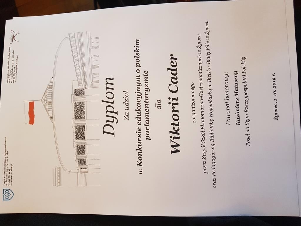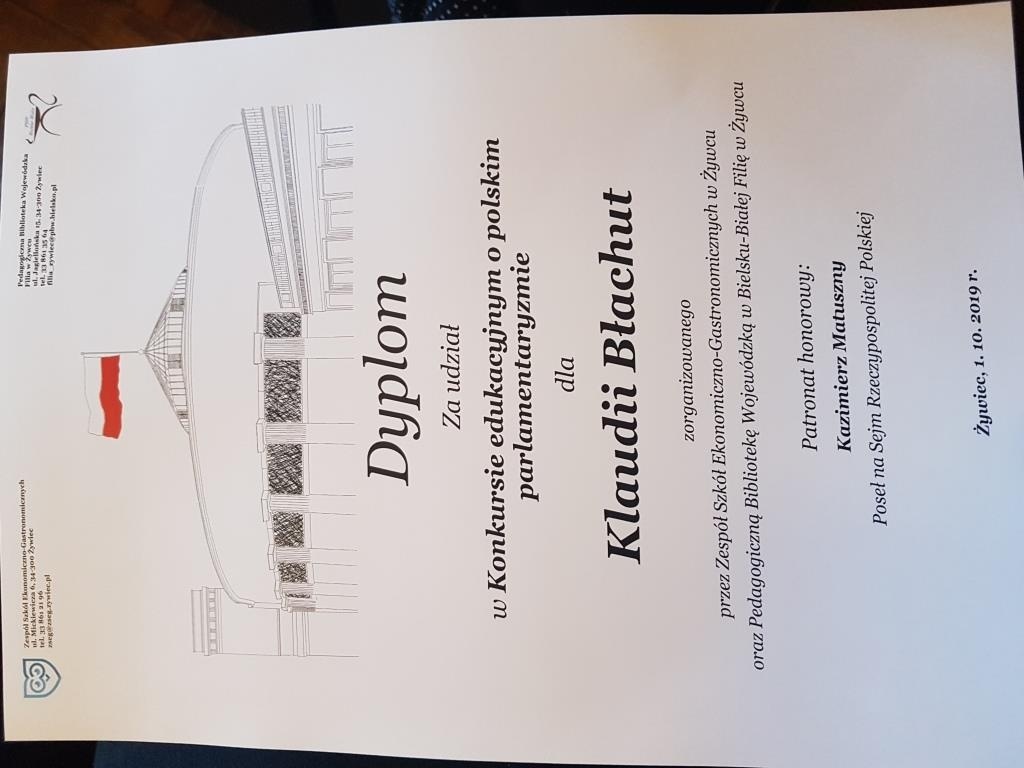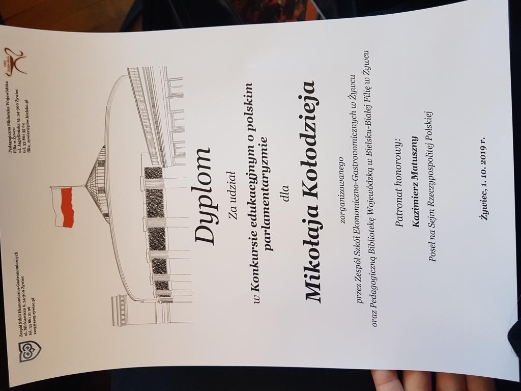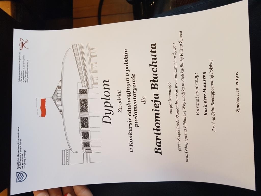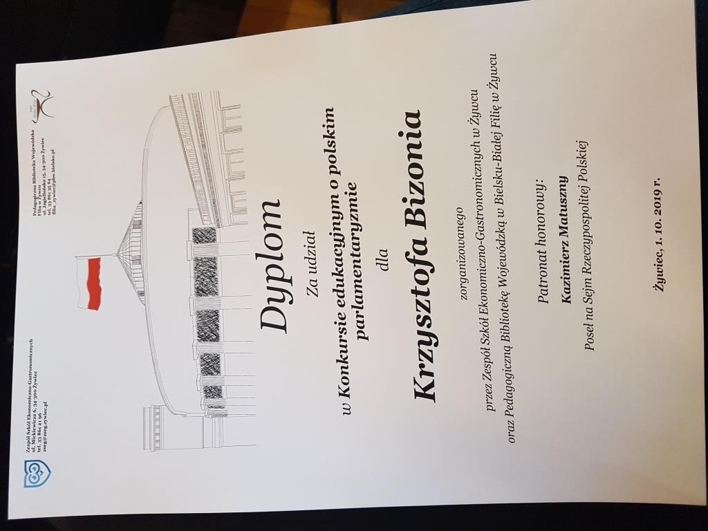 1. października w Zespole Szkół Ekonomiczno-Gastronomicznych w Żywcu odbył się „Konkurs edukacyjny o polskim parlamentaryzmie”. Współorganizatorami konkursu byli: Zespół Szkół Ekonomiczno-Gastronomicznych w Żywcu oraz Pedagogiczna Biblioteka Wojewódzka w Bielsku-Białej Filia w Żywcu, a jego inicjatorem Poseł na Sejm RP Kazimierz Matuszny. Konkurs, który miał zachęcić młodzież do poszerzenia wiedzy o współczesnym polskim parlamentaryzmie, adresowany był do uczniów szkół ponadpodstawowych z terenu powiatu żywieckiego. Młodzież naszej szkoły reprezentowali uczniowie w składzie: Klaudia Błachut, Martyna Błachut, Wiktoria Cader, Joanna Gluza, Oliwia Kocoń (kl. III cLO), Krzysztof Bizoń, Bartłomiej Błachut, Dominik Dybał (kl. IV bT) i Mikołaj Kołodziej (kl. II dT). Do grona wyróżnionych w konkursie uczniów dołączył przedstawiciel naszej szkoły Krzysztof Bizoń, który uzyskał IV miejsce. Uczniami opiekowali się mgr Rafał Harańczyk, dr Lucjan Sawicki i dr Małgorzata Terteka.