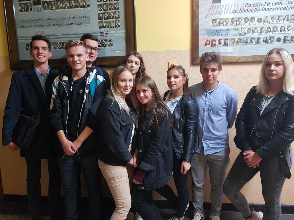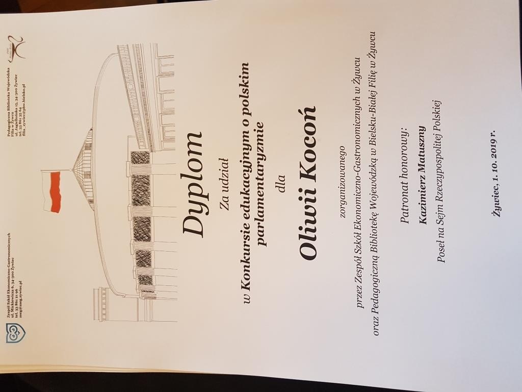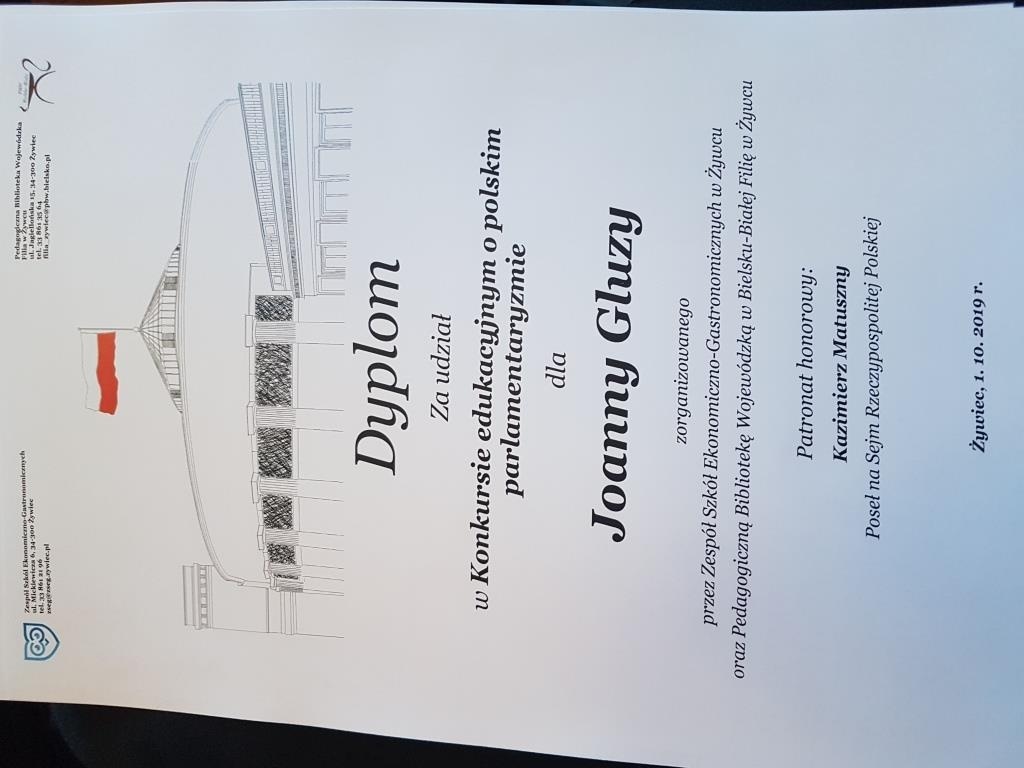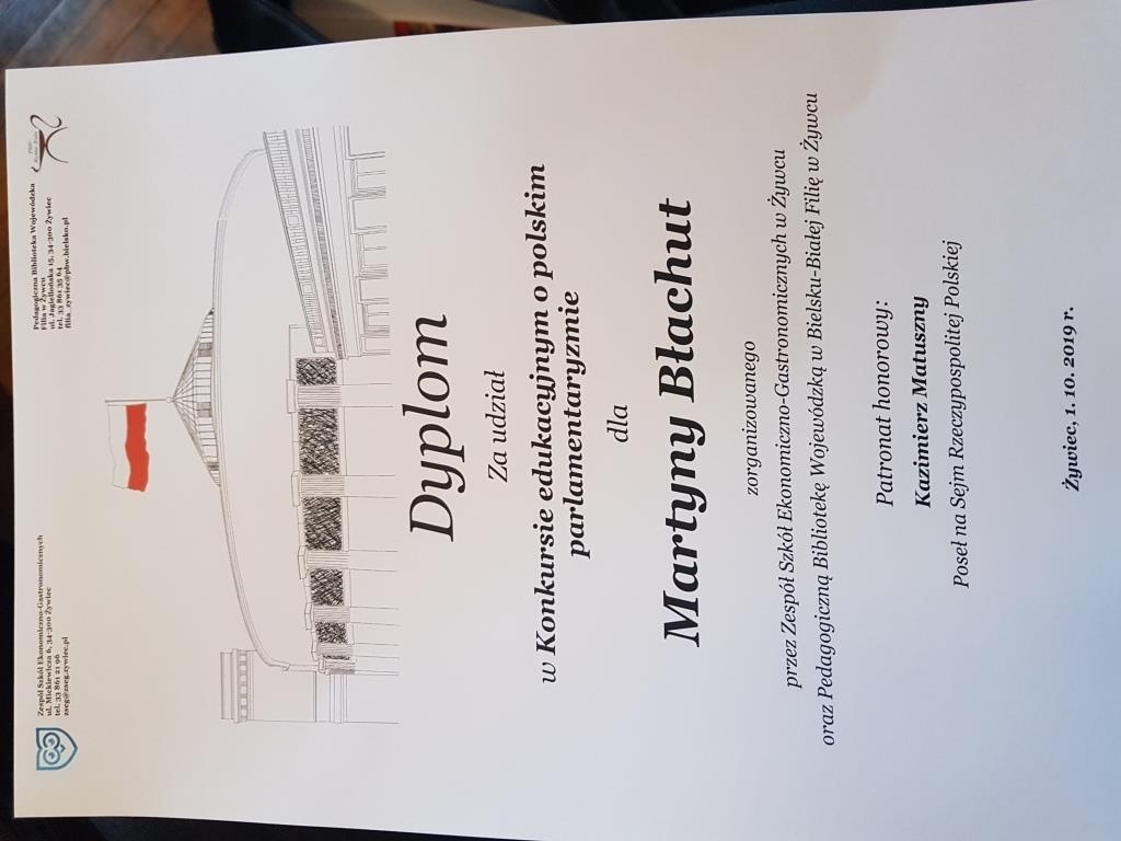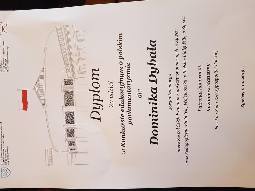 1. października w Zespole Szkół Ekonomiczno-Gastronomicznych w Żywcu odbył się „Konkurs edukacyjny o polskim parlamentaryzmie”. Współorganizatorami konkursu byli: Zespół Szkół Ekonomiczno-Gastronomicznych w Żywcu oraz Pedagogiczna Biblioteka Wojewódzka w Bielsku-Białej Filia w Żywcu, a jego inicjatorem Poseł na Sejm RP Kazimierz Matuszny. Konkurs, który miał zachęcić młodzież do poszerzenia wiedzy o współczesnym polskim parlamentaryzmie, adresowany był do uczniów szkół ponadpodstawowych z terenu powiatu żywieckiego. Młodzież naszej szkoły reprezentowali uczniowie w składzie: Klaudia Błachut, Martyna Błachut, Wiktoria Cader, Joanna Gluza, Oliwia Kocoń (kl. III cLO), Krzysztof Bizoń, Bartłomiej Błachut, Dominik Dybał (kl. IV bT) i Mikołaj Kołodziej (kl. II dT). Do grona wyróżnionych w konkursie uczniów dołączył przedstawiciel naszej szkoły Krzysztof Bizoń, który uzyskał IV miejsce. Uczniami opiekowali się mgr Rafał Harańczyk, dr Lucjan Sawicki i dr Małgorzata Terteka.