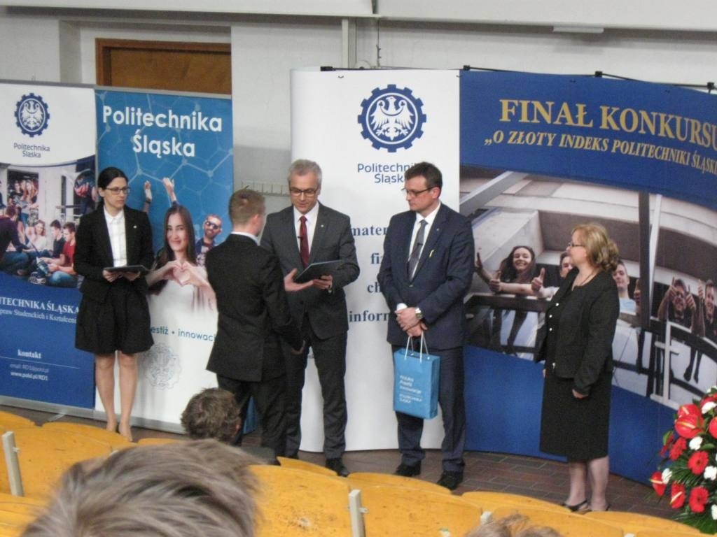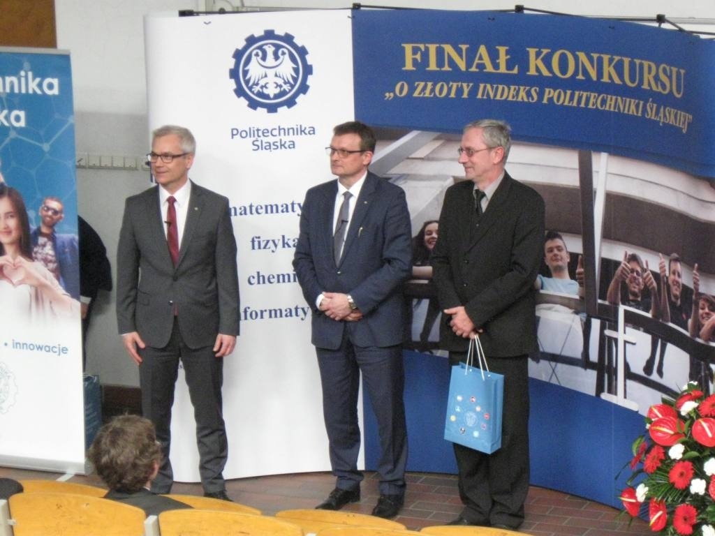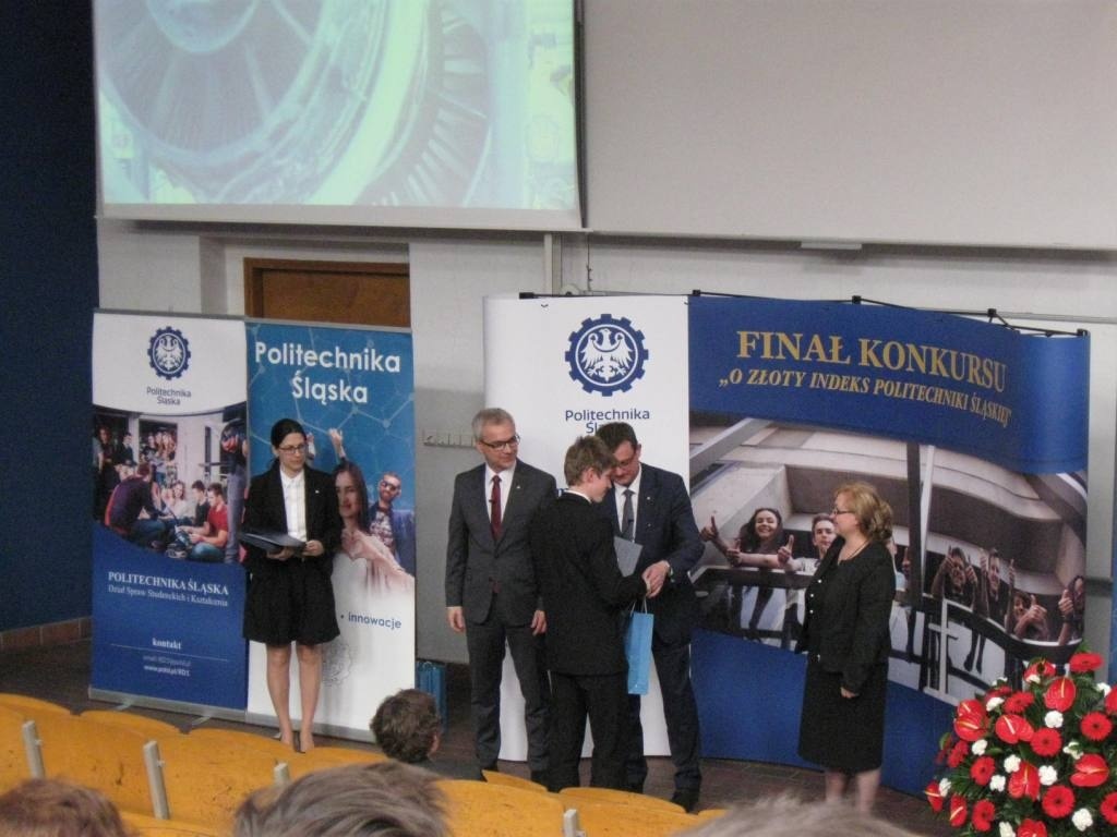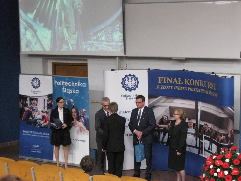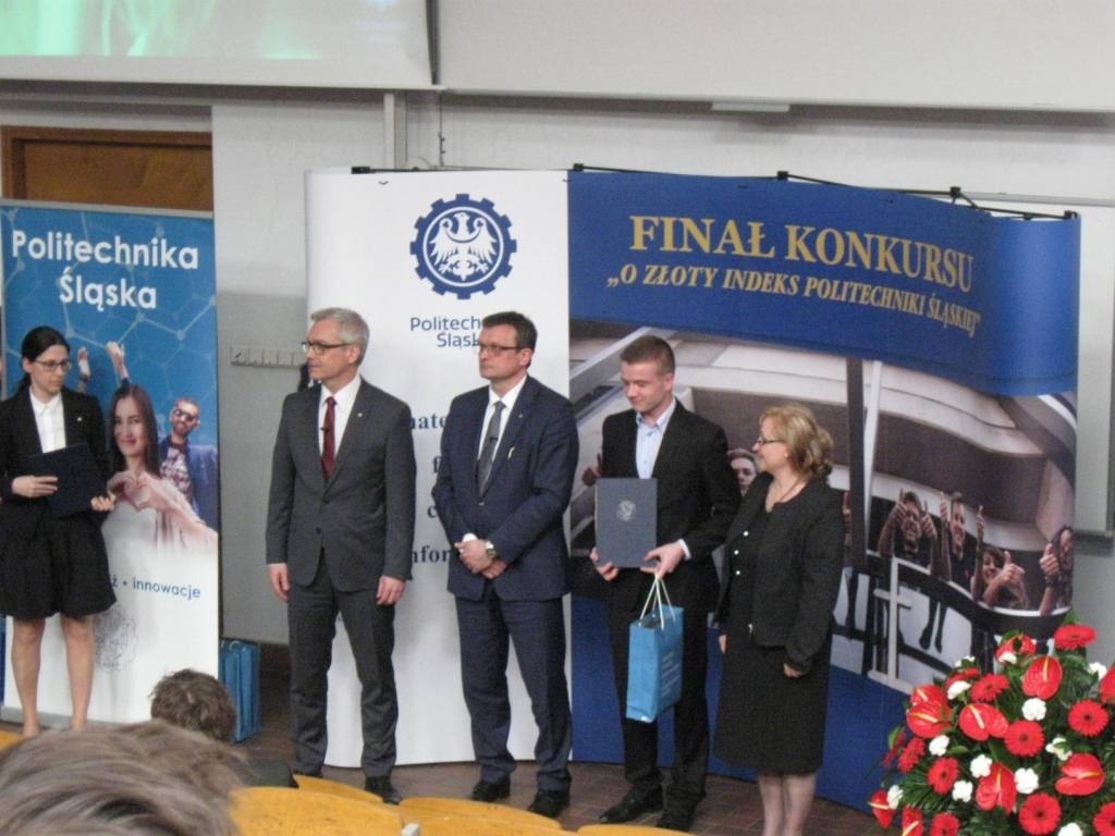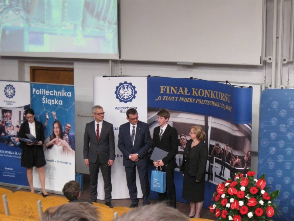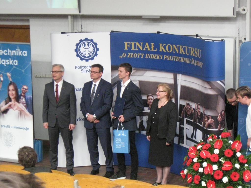 Z dumą informujemy o sukcesie uczniów ZSME: Krzysztofa Babickiego z klasy III eT, Michała Wnętrzaka z klasy II eT i Mateusza Zagórskiego z klasy III eT w Ogólnopolskim Konkursie "O złoty indeks Politechniki Śląskiej" w dziedzinie fizyki. Uczniowie uzyskali tytuł laureata I stopnia i co jest z tym związane możliwość wyboru dowolnego kierunku studiów na Politechnice Śląskiej. 20 kwietnia uczestniczyli w uroczystości wręczenia dyplomów i atrakcyjnych nagród w auli Wydziału Górnictwa i Geologii Politechniki Śląskiej w Gliwicach. Warto podkreślić, że w konkursie przyznano 9 indeksów z fizyki, a aż 3 z nich otrzymali uczniowie z żywieckiego Mechanika. Gratulujemy uczniom i opiekunom - p. Bożenie Piątek i p. Andrzejowi Kapuście.