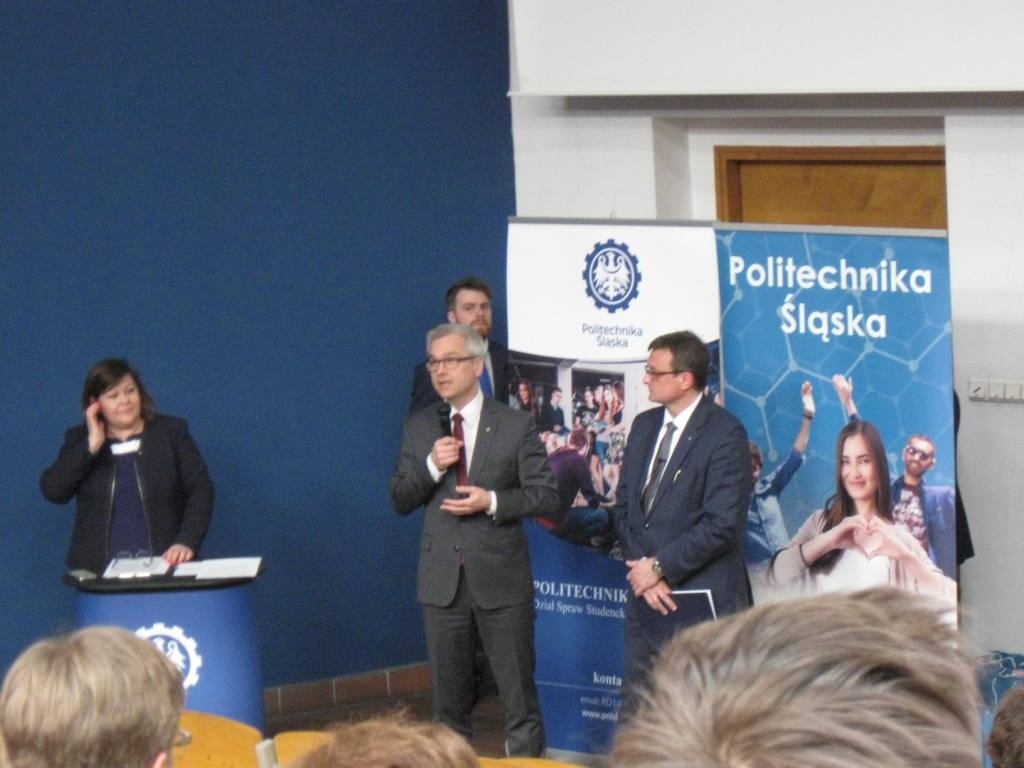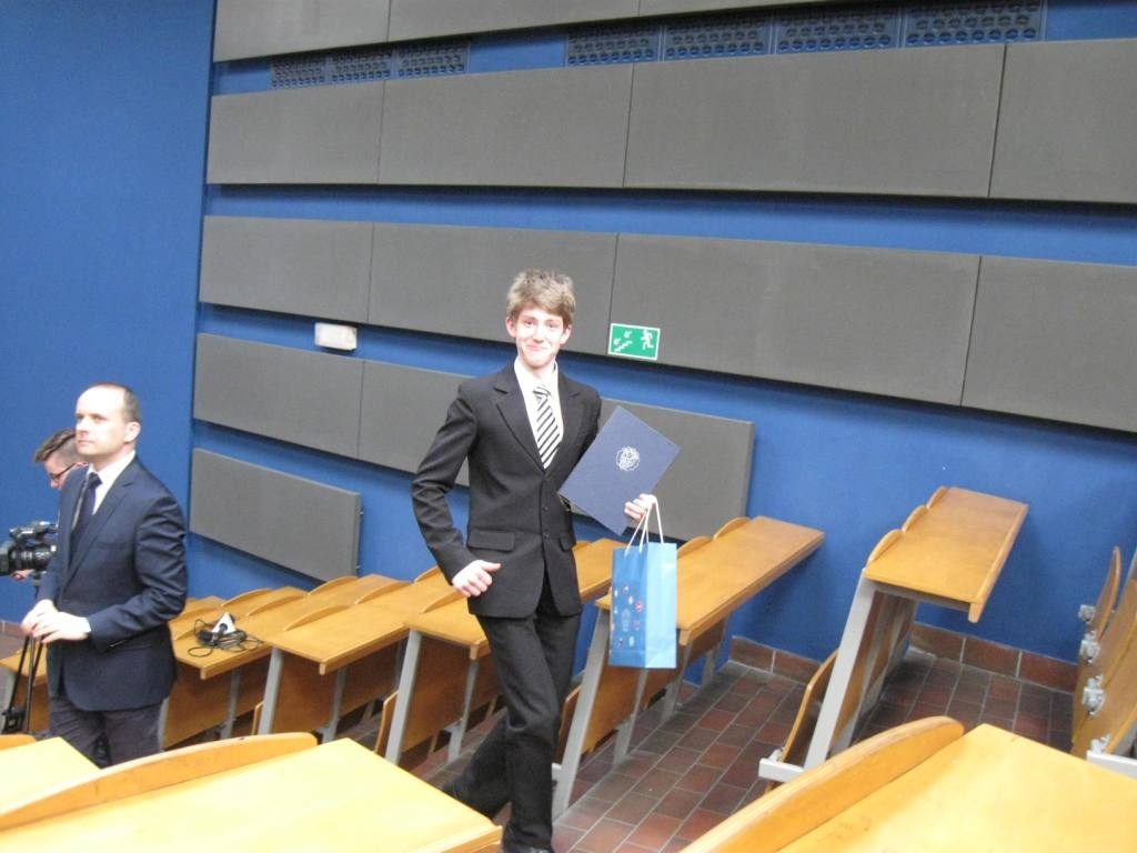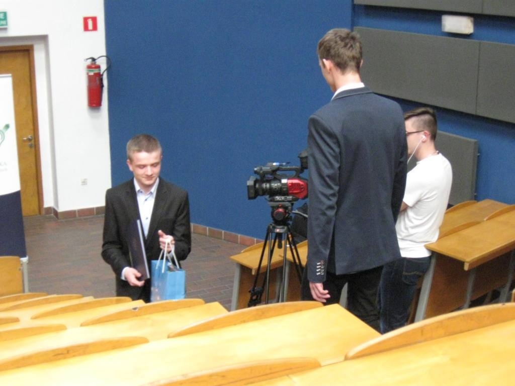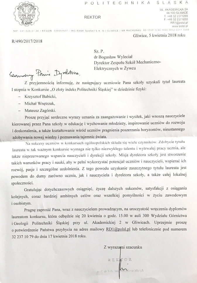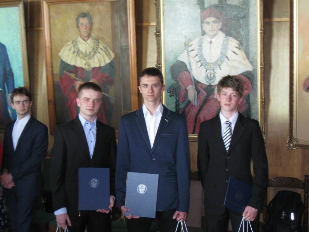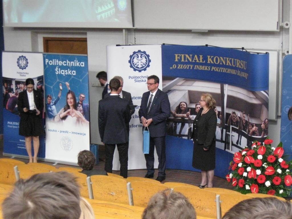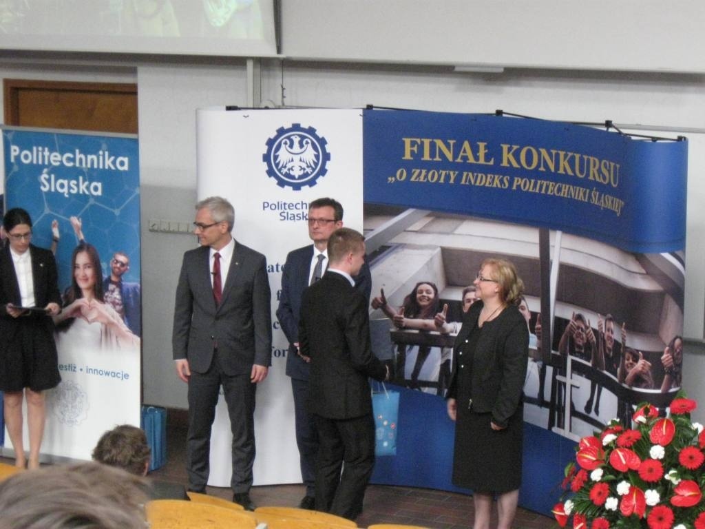Z dumą informujemy o sukcesie uczniów ZSME: Krzysztofa Babickiego z klasy III eT, Michała Wnętrzaka z klasy II eT i Mateusza Zagórskiego z klasy III eT w Ogólnopolskim Konkursie "O złoty indeks Politechniki Śląskiej" w dziedzinie fizyki. Uczniowie uzyskali tytuł laureata I stopnia i co jest z tym związane możliwość wyboru dowolnego kierunku studiów na Politechnice Śląskiej. 20 kwietnia uczestniczyli w uroczystości wręczenia dyplomów i atrakcyjnych nagród w auli Wydziału Górnictwa i Geologii Politechniki Śląskiej w Gliwicach. Warto podkreślić, że w konkursie przyznano 9 indeksów z fizyki, a aż 3 z nich otrzymali uczniowie z żywieckiego Mechanika. Gratulujemy uczniom i opiekunom - p. Bożenie Piątek i p. Andrzejowi Kapuście.