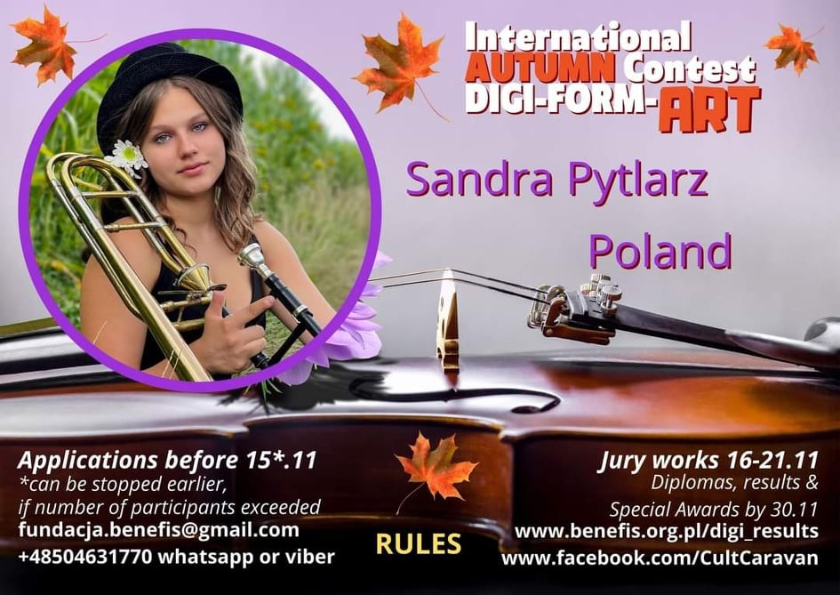 Sandra została również laureatką INTERNATIONAL AUTUMN CONTEST DIGI-FORM ART 2022. Konkurs jest przeznaczony dla artystycznie uzdolnionej młodzieży, która ma szansę zaprezentować swoje talenty muzyczne, taneczne, plastyczne czy teatralne. Tegoroczna edycja, już kolejny raz, odbyła się online, Sandra rywalizowała z ponad 50 uczestnikami zajmując II miejsce w swojej kategorii wiekowej 16-18 lat (utwór "Czarne Perfumy" Agnieszki Osieckiej).