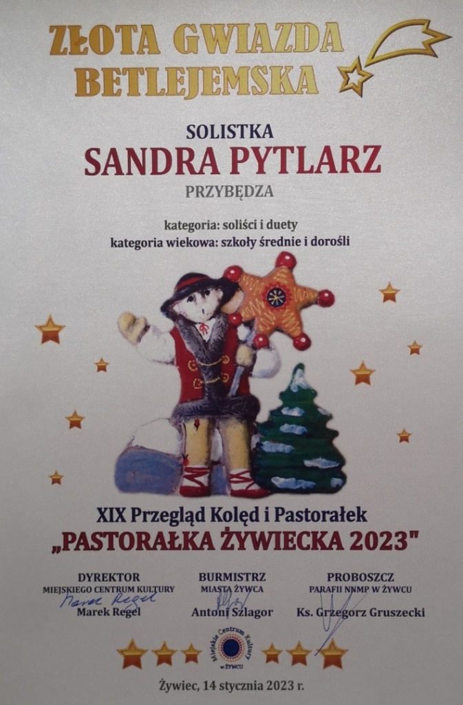 - Złotą Gwiazdę Betlejemską w XIX Przeglądzie Kolęd i Pastorałek "Pastorałka Żywiecka" 2023