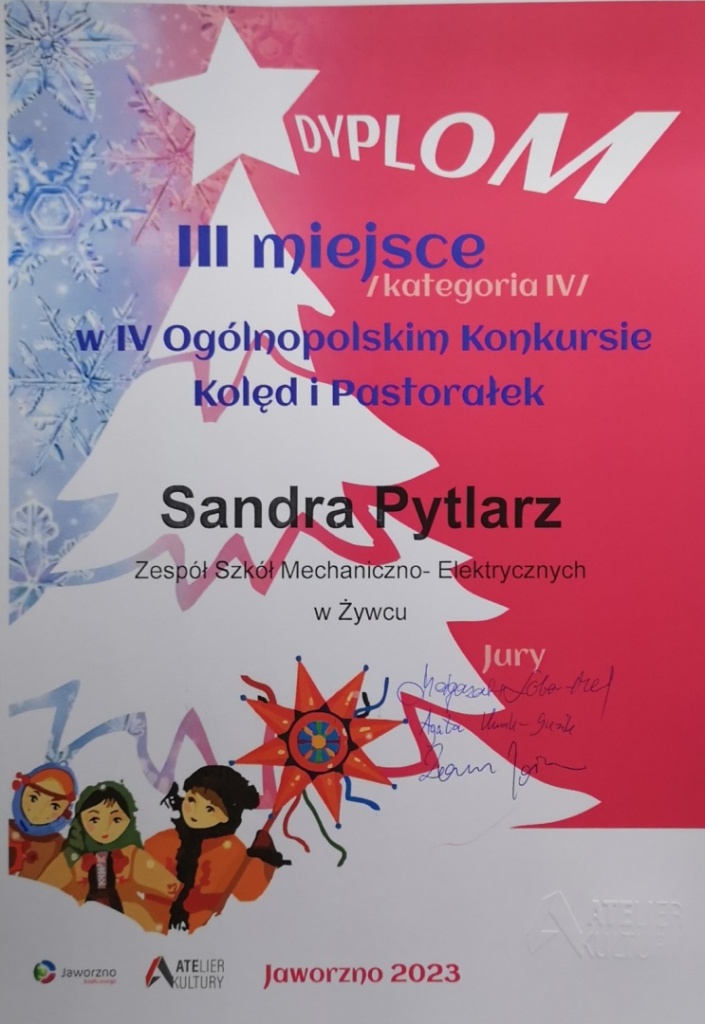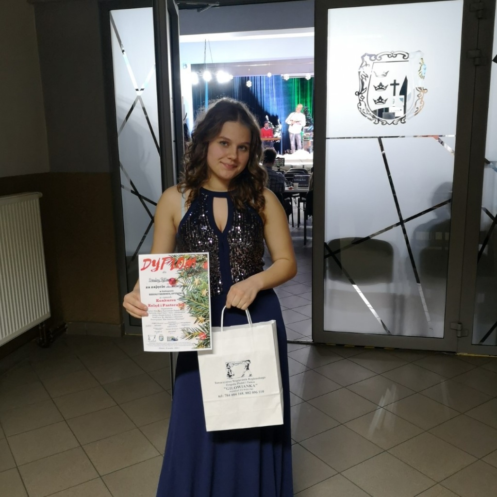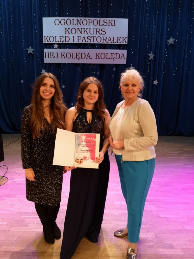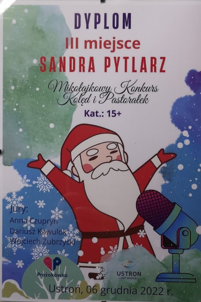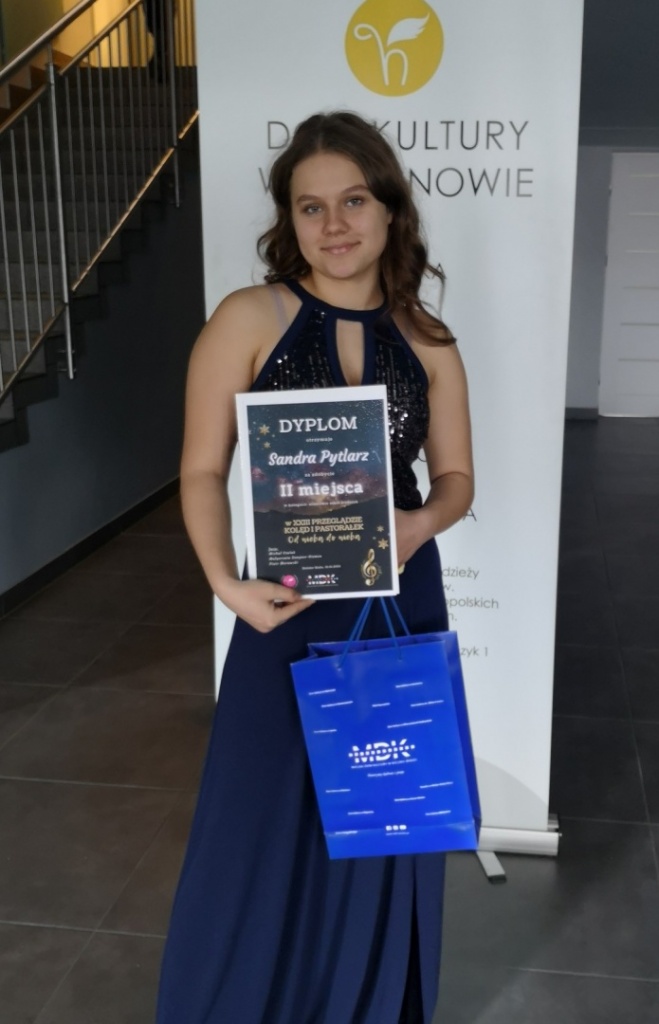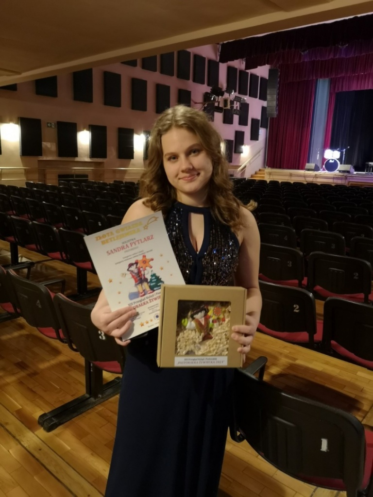 Sandra reprezentowała naszą szkołę w kategorii solo - wokal, śpiewając m.in.: „Nie było miejsca dla Ciebie", „Cicho, cicho pastuszkowie", „Cicha noc". Miło nam poinformować, że została laureatką następujących konkursów zdobywając: