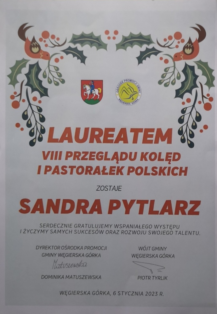 - tytuł laureatki VIII Przeglądu Kolęd i Pastorałek Polskich . Węgierska Górka 2023