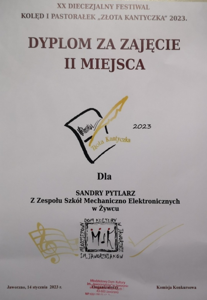 - II miejsce w XX Diecezjalnym Festiwalu Kolęd i Pastorałek "Złota Kantyczka" Jaworzno 2023