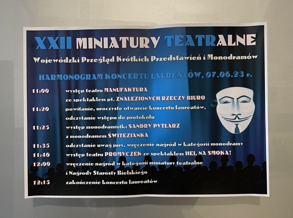 7 czerwca 2023 w GOK w Buczkowicach odbyła się gala laureatów Wojewódzkiego Przeglądu Krótkich Przedstawień i Monodramów XXII MINIATURY TEATRALNE , podczas której wystąpiła nasza uczennica Sandra Pytlarz z klasy 2BLO. Sandra zaprezentowała monodram "Świteźianka" Adama Mickiewicza, zajmując I miejsce w kategorii szkoły ponadpodstawowe. Do konkursu przytapiło 13 zespołów teatralnych i 14 monodramistów, którzy zaprezentowali się podczas dwudniowych przesłuchań 15-16 maja. Współorganizatorem przedsięwzięcia było Starostwo Powiatowe w Bielsku-Białej. Honorowy patronat nad przedsięwzięciem objęli: Wójt Gminy Buczkowice Józef Caputa i Starosta Bielski Andrzej Płonka.