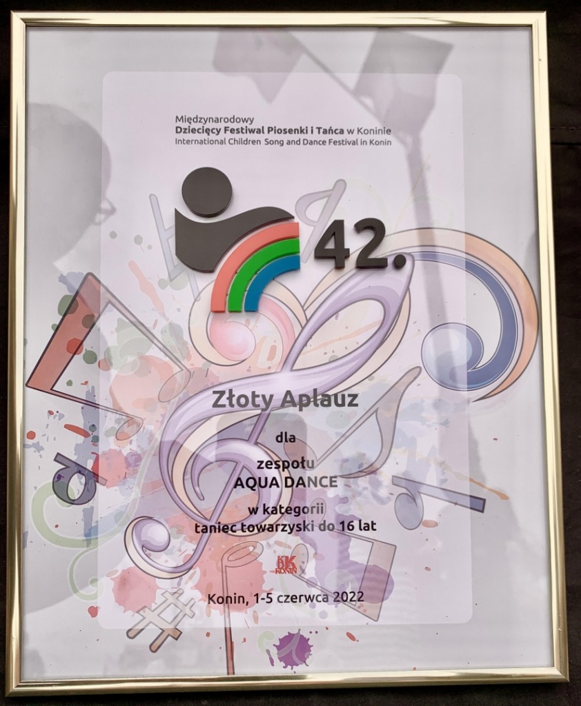 W dniach 1-5 czerwca 2022r. Formacja Aqua Dance pod kierownictwem Anny Kamińskiej, wzięła udział w 42. Międzynarodowym Dziecięcym Festiwalu Piosenki i Tańca - Konin 2022