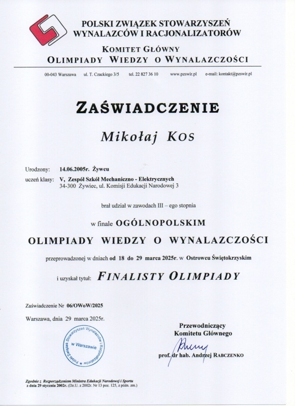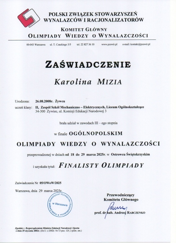 W dniach 28– 29 marca.2025r. odbyły się finały Ogólnopolskiej Olimpiady Wiedzy o Wynalazczości. Dwóch uczniów naszej szkoły udało się do Ostrowca Świętokrzyskiego. aby walczyć o zaszczytne tytuły. Karolina Mizia z klasy 2c i Mikołaj Kos z klasy 5c uzyskali tytuł FINALISTY. W Ogólnopolskim Finale zajęli VI miejsce w reprezentacji Okręgu Bielsko-Bialskiego/Podbeskidzie. W czasie wolnym uczniowie mile spędzali czas zwiedzając Muzeum Archeologiczne i Rezerwat Krzemionki. Na uwagę zasługuje kompleks turystyczny w Bałtowie (Zwierzyniec Bałtowski, JuraPark, Kino Emocji Cinema5D)
