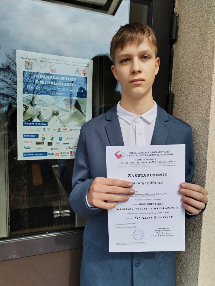 Finał Centralny składał się z trzech części. Maurycy Marek w uzyskał tytuł Finalisty etapu centralnego. Część pierwsza etapu centralnego odbywała się online w dniu 15 marca i składała się z 40 pytań testowych z historii wynalazków oraz ustawy Prawo Własności Przemysłowej. Warunkiem awansu do drugiej i trzeciej części było osiągnięcie wymaganego progu ponad 50%. Najlepiej z naszych uczniów poradził sobie Maurycy Marek który awansował do drugiego i trzeciego etapu który odbywał się w dniach 22 i 23 marca w Nisku. W części drugiej miał do rozwiązania cztery zadania problemowe z historii wynalazków oraz ustawy Prawo Własności Przemysłowej. Maurycy w Nisku spisał się bardzo dobrze i uzyskał tytuł FINALISTY. Gratulujemy i życzymy dalszych sukcesów.