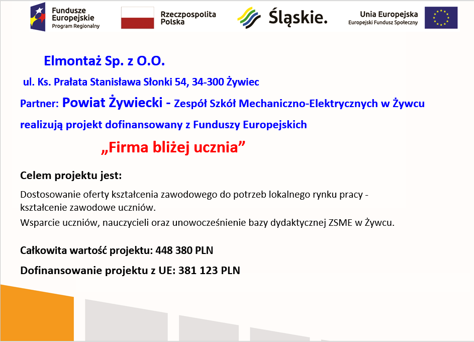 Celem Projektu jest przygotowanie uczniów branży elektrycznej BS I St. i Technikum w Zespole Szkół Mechaniczno – Elektrycznych w Żywcu do potrzeb rynku pracy, w tym realizację staży w Firmie przez 24 uczniów.
