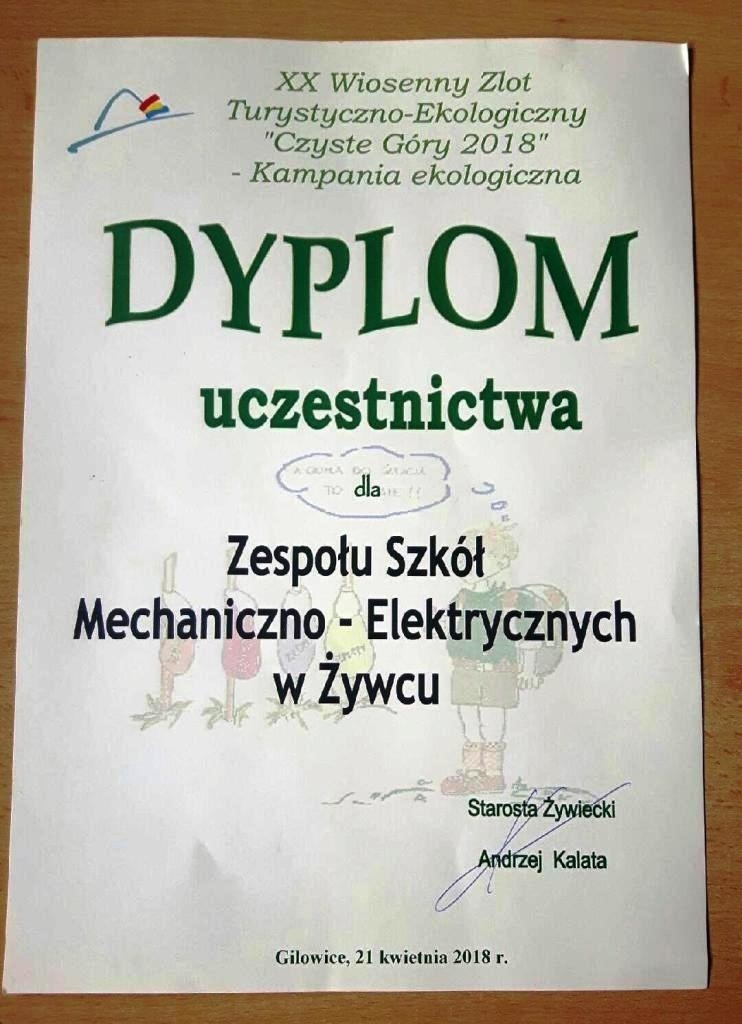 Już po raz XX Wydział Turystyki, Kultury, Sportu i Promocji Starostwa Powiatowego w Żywcu, w tym roku we współpracy z Zespołem Szkół w Gilowicach zorganizował Kampanię Ekologiczną - Wiosenny Zlot Turystyczno-Ekologiczny „Czyste Góry 2018”. Wydarzenie odbyło się w minioną sobotę, tj. 21 kwietnia 2018 r., a jego celem jak poprzednim razem było: porządkowanie szlaków turystycznych oraz promowanie turystyki kwalifikowanej przez rozwijanie sprawności fizycznej młodzieży i jej zamiłowania do poznawania piękna krajobrazu „Małej Ojczyzny”. Naszą drużynę turystyczną w łącznym składzie 12 osób reprezentowali uczniowie z klas licealnych. W trakcie kilkugodzinnego przemarszu pokonaliśmy łącznie odległość ok. 13 km i kilkaset metrów przewyższenia. Ponadto, Przemysław Papiernik z klasy 2ET zajął II miejsce w indywidualnym Konkursie Ekologiczno-Krajoznawczym. Opiekunami młodzieży byli mgr Małgorzata Bułaczyńska